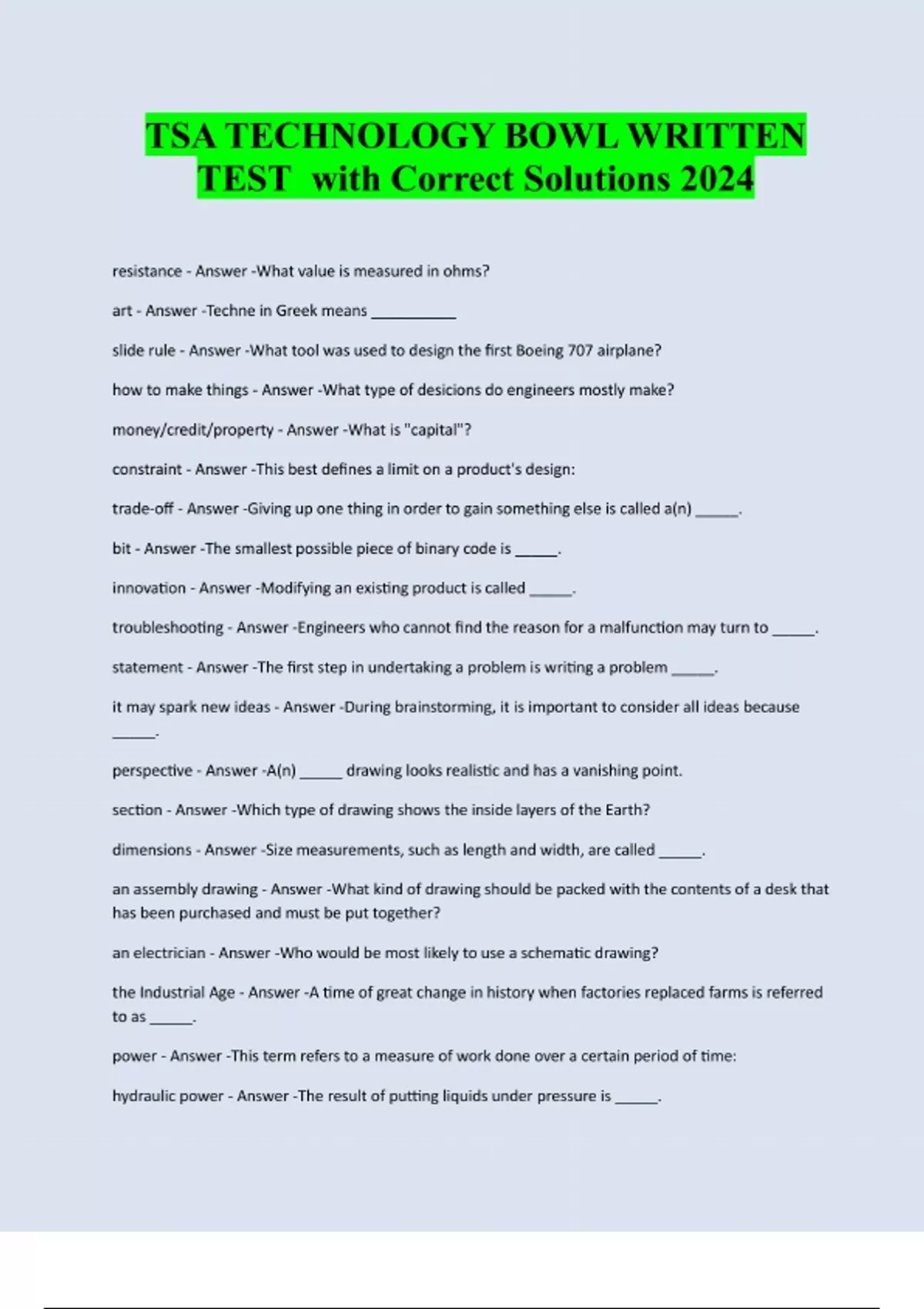 TSA TECHNOLOGY BOWL WRITTEN TEST with Correct Solutions 2024 resistance - Answer -What value is measured in ohms? art - Answer -Techne in Greek means __________ slide rule - Answer -What tool was used to design the first Boeing 707 airplane? how to make things - Answer -What type of desicions do engineers mostly make? money/credit/property - Answer -What is "capital"? constraint - Answer -This best defines a limit on a product's design: trade-off - Answer -Giving up one thing in order to gain something else is called a(n) _____. bit - Answer -The smallest possible piece of binary code is _____. innovation - Answer -Modifying an existing product is called _____. troubleshooting - Answer -Engineers who cannot find the reason for a malfunction may turn to _____. statement - Answer -The first step in undertaking a problem is writing a problem _____. it may spark new ideas - Answer -During brainstorming, it is important to consider all ideas because _____. perspective - Answer -A(n) _____ drawing looks realistic and has a vanishing point. section - Answer -Which type of drawing shows the inside layers of the Earth? dimensions - Answer -Size measurements, such as length and width, are called _____. an assembly drawing - Answer -What kind of drawing should be packed with the contents of a desk that has been purchased and must be put together? an electrician - Answer -Who would be most likely to use a schematic drawing? the Industrial Age - Answer -A time of great change in history when factories replaced farms is referred to as _____. power - Answer -This term refers to a measure of work done over a certain period of time: hydraulic power - Answer -The result of putting liquids under pressure is _____.efficiency - Answer -The ability to achieve a desired result with as little effort and waste as possible is _____. resistance - Answer -Adding components to an electrical circuit increases the _____. parallel circuit - Answer -Which term describes an electrical circuit that has more than one path? person to machine - Answer -What mode of communication is involved when a person programs an alarm clock? machine to person - Answer -What mode of communication is involved when the alarm clock goes off in the morning? geosynchronous - Answer -When a satellite does not seem to move, it is said to be in a _____ orbit. binary code - Answer -The code of 1s and 0s that computers use is called _____. wheel - Answer -The gear is based on which simple machine? distributed computing - Answer -What term describes networked computers that use downtime for research? human - Answer -A computer error is most often a(n) _____ error. pixel - Answer -One tiny dot of light on a video image is known as a _____. HTML - Answer -What language is used to encode Web pages? motion capture - Answer -_____ is used to create computer-generated characters. producer - Answer -A(n) _____ is financially responsible for every aspect of a TV show or film. safe wholesome milk - Answer -The benefit of pasteurization is _____. kill bacteria - Answer -Antibiotics can _____. gene therapy - Answer -_____ technology uses a harmless virus to deliver a normal gene to body cells. US Department of Agriculture - Answer -Which government agency approves or rejects genetically modified food products? scientific management - Answer -Frederick Taylor originated the production practice known as _____. quality control - Answer -_____consists