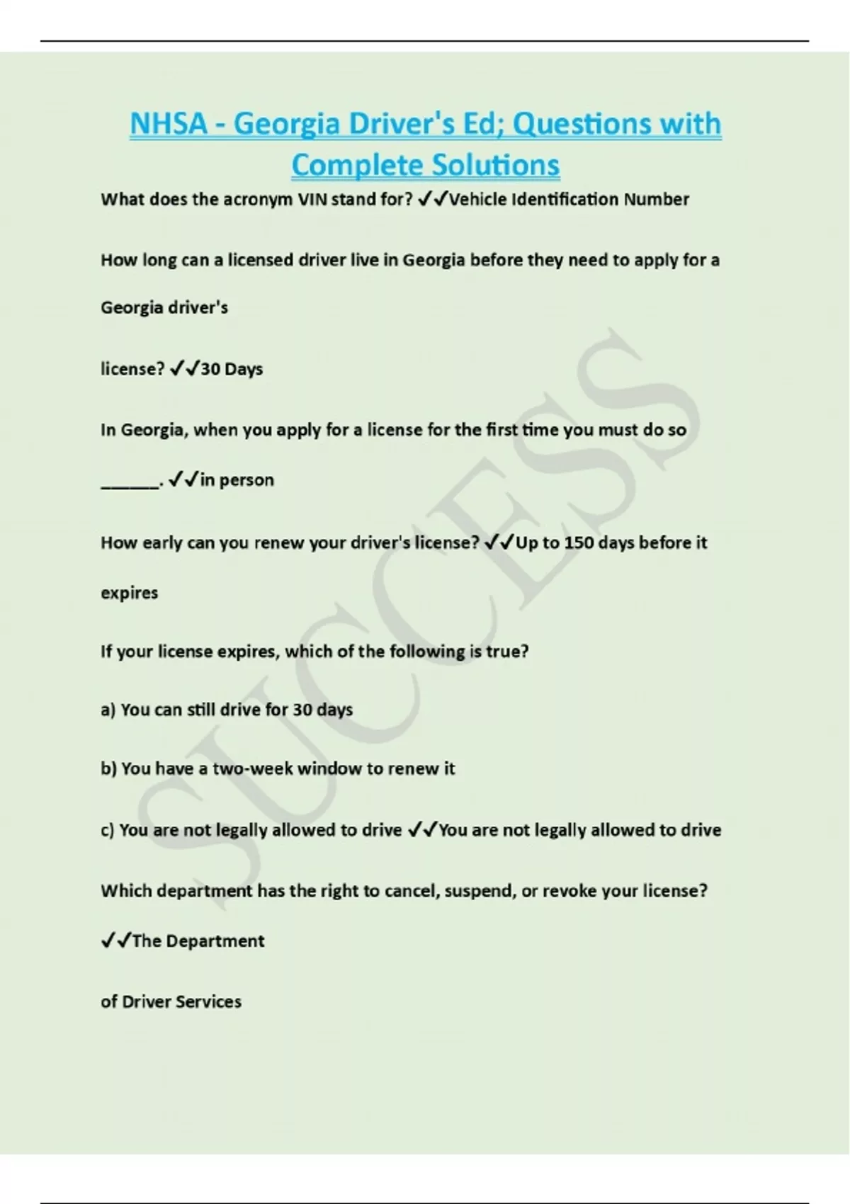 NHSA - Georgia Driver's Ed; Questions and Answers 100% Solved