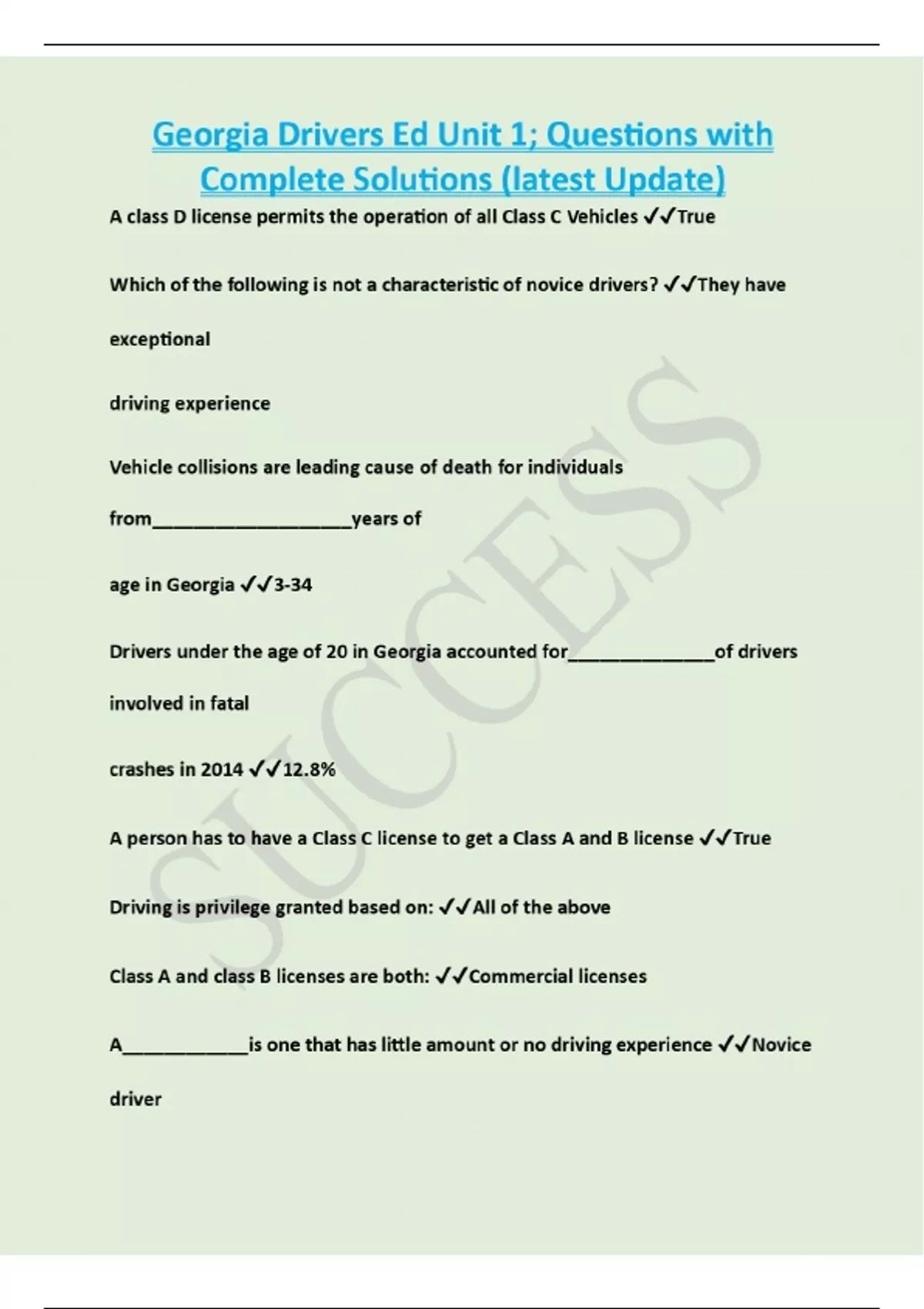 Georgia Drivers Ed Unit 1; Questions with Answers 100% Correct