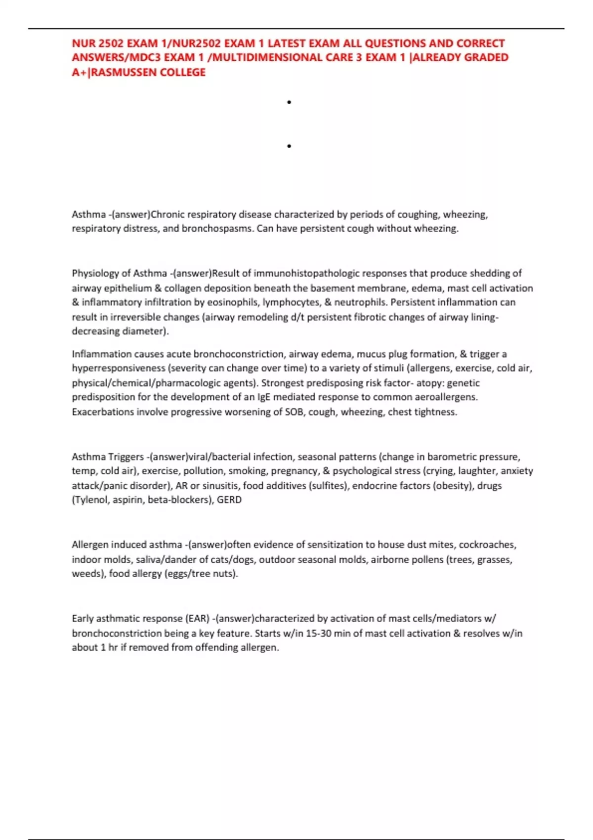 Early asthmatic response (EAR) -(answer)characterized by activation of mast cells/mediators w/