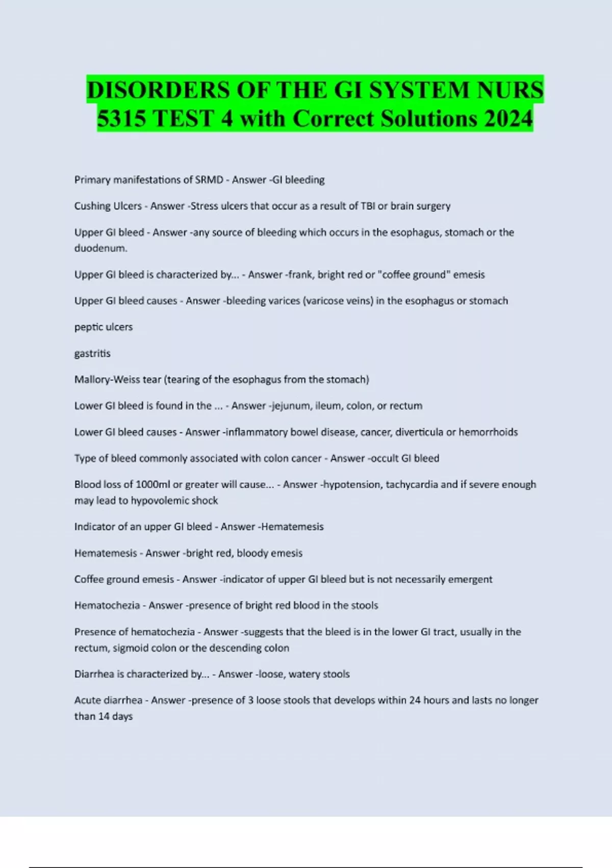 DISORDERS OF THE GI SYSTEM NURS 5315 TEST 4 with Correct Solutions 2024 Primary manifestations of SRMD - Answer -GI bleeding Cushing Ulcers - Answer -Stress ulcers that occur as a result of TBI or brain surgery Upper GI bleed - Answer -any source of bleeding which occurs in the esophagus, stomach or the duodenum. Upper GI bleed is characterized by... - Answer -frank, bright red or "coffee ground" emesis Upper GI bleed causes - Answer -bleeding varices (varicose veins) in the esophagus or stomach peptic ulcers gastritis Mallory-Weiss tear (tearing of the esophagus from the stomach) Lower GI bleed is found in the ... - Answer -jejunum, ileum, colon, or rectum Lower GI bleed causes - Answer -inflammatory bowel disease, cancer, diverticula or hemorrhoids Type of bleed commonly associated with colon cancer - Answer -occult GI bleed Blood loss of 1000ml or greater will cause... - Answer -hypotension, tachycardia and if severe enough may lead to hypovolemic shock Indicator of an upper GI bleed - Answer -Hematemesis Hematemesis - Answer -bright red, bloody emesis Coffee ground emesis - Answer -indicator of upper GI bleed but is not necessarily emergent Hematochezia - Answer -presence of bright red blood in the stools Presence of hematochezia - Answer -suggests that the bleed is in the lower GI tract, usually in the rectum, sigmoid colon or the descending colon Diarrhea is characterized by... - Answer -loose, watery stools Acute diarrhea - Answer -presence of 3 loose stools that develops within 24 hours and lasts no longer than 14 dayspersistent diarrhea - Answer