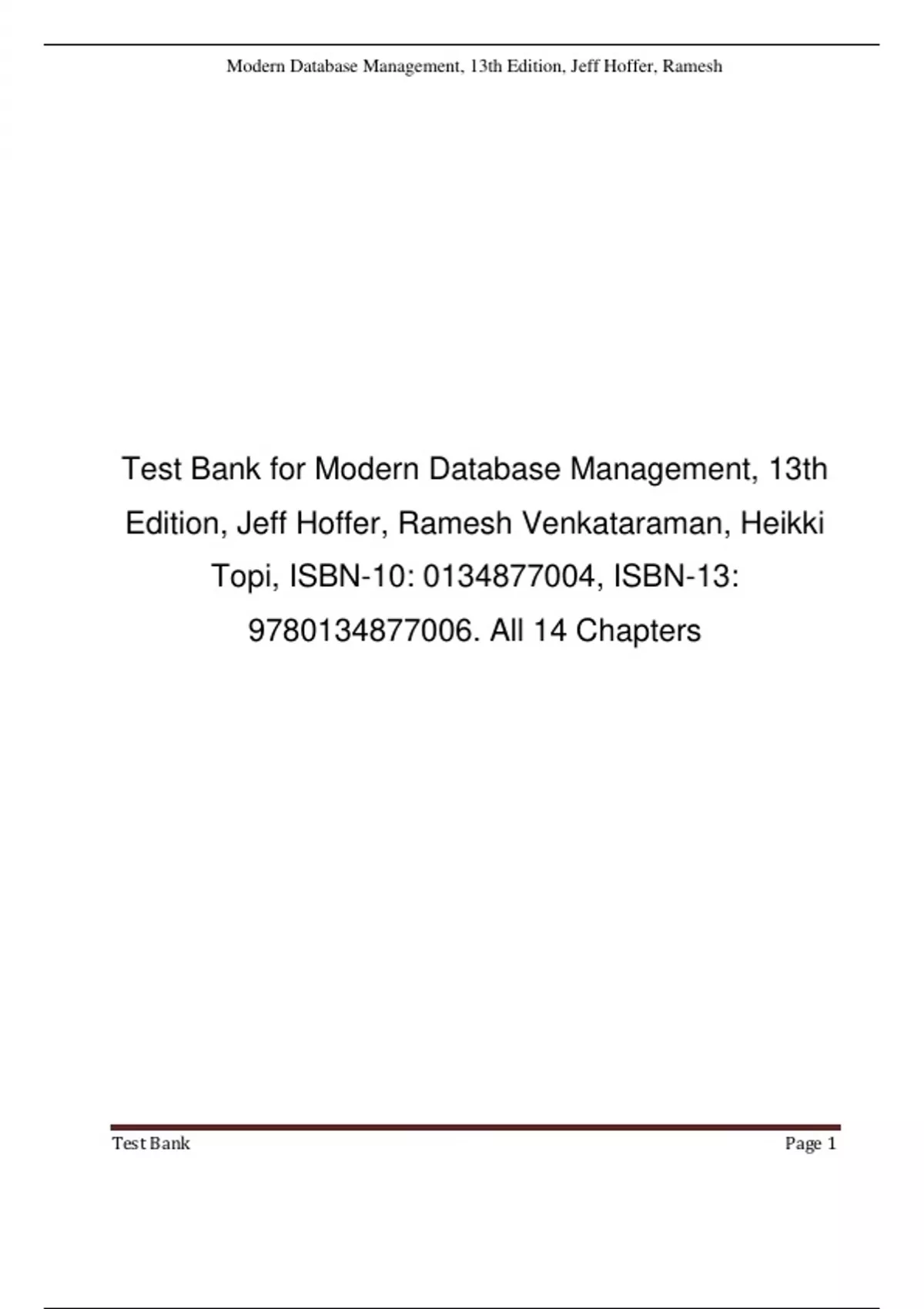 Test Bank for Modern Database Management, 13th Edition, Jeff Hoffer, Ramesh Venkataraman, Heikki Topi, All 14 Chapters.