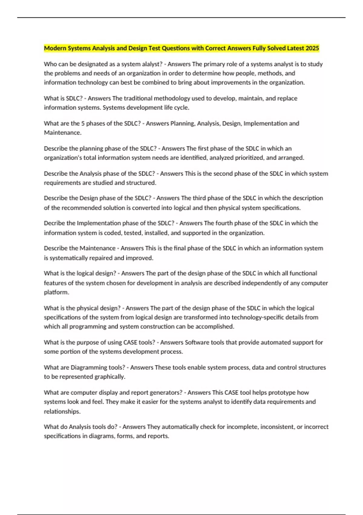 Modern Systems Analysis and Design Test Questions with Correct Answers Fully Solved Latest 2025 Who can be designated as a system alalyst? - Answers The primary role of a systems analyst is to study the problems and needs of an organization in order to determine how people, methods, and information technology can best be combined to bring about improvements in the organization. What is SDLC? - Answers The traditional methodology used to develop, maintain, and replace information systems. Systems development life cycle. What are the 5 phases of the SDLC? - Answers Planning, Analysis, Design, Implementation and Maintenance. Describe the planning phase of the SDLC? - Answers The first phase of the SDLC in which an organization's total information system needs are identified, analyzed prioritized, and arranged. Describe the Analysis phase of the SDLC? - Answers This is the second phase of the SDLC in which system requirements are studied and structured. Describe the Design phase of the SDLC? - Answers The third phase of the SDLC in which the description of the recommended solution is converted into logical and then physical system specifications. Decribe the Implementation phase of the SDLC? - Answers The fourth phase of the SDLC in which the information system is coded, tested, installed, and supported in the organization. Describe the Maintenance - Answers This is the final phase of the SDLC in which an information system is systematically repaired and improved. What is the logical design? - Answers The part of the design phase of the SDLC in which all functional features of the system chosen for development in analysis are described independently of any computer platform. What is the physical design? - Answers The part of the design phase of the SDLC in which the logical specifications of the system from logical design are transformed into technology-specific details from which all programming and system construction can be accomplished. What is the purpose of using CASE tools? - Answers Software tools that provide automated support for some portion of the systems development process. What are Diagramming tools? - Answers These tools enable system process, data and control structures to be represented graphically. What are computer display and report generators? - Answers This CASE tool helps prototype how systems look and feel. They make it easier for the systems analyst to identify data requirements and relationships. What do Analysis tools do? - Answers They automatically check for incomplete, inconsistent, or incorrect specifications in diagrams, forms, and reports.