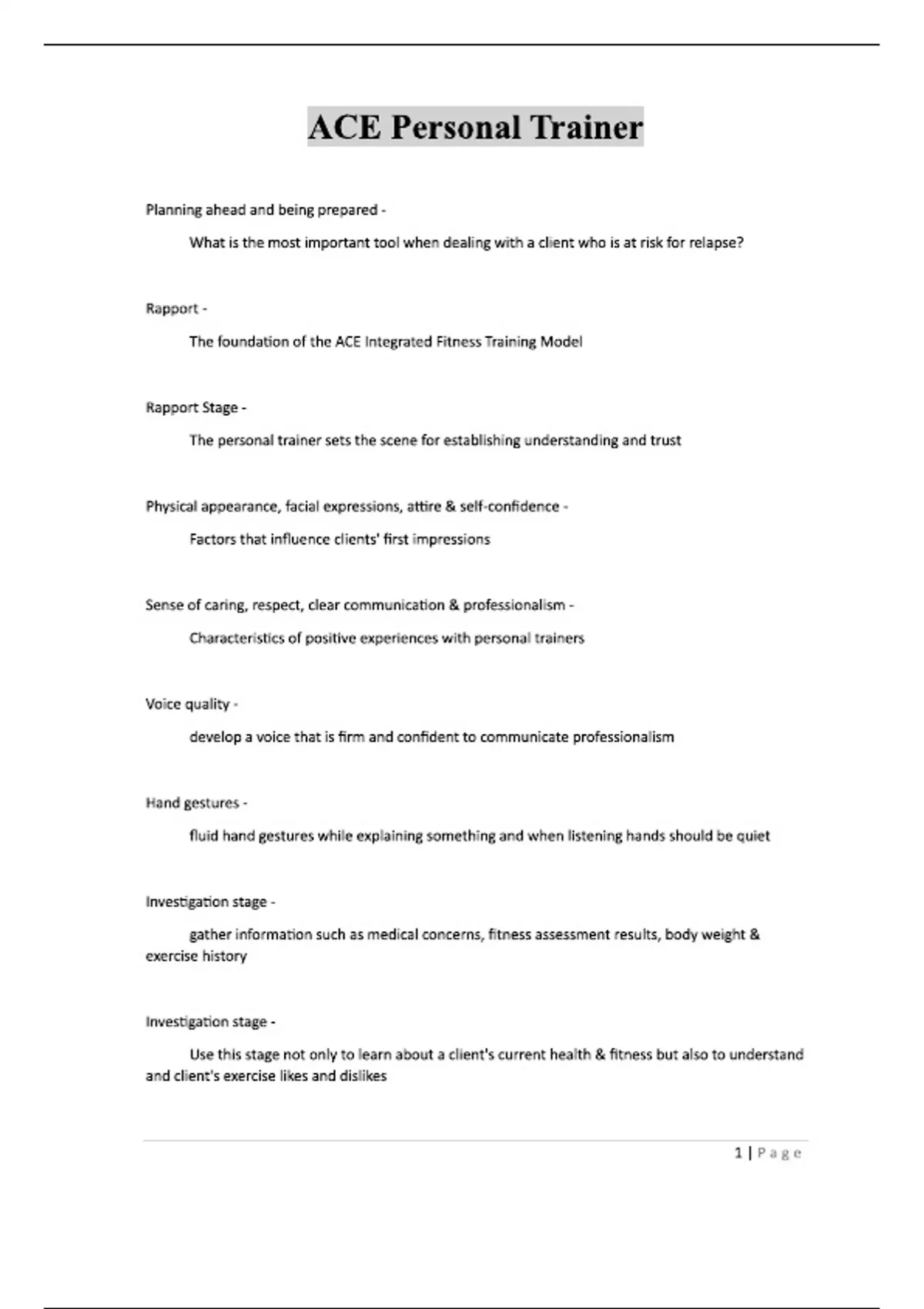 ACE Personal Trainer Test questions from Study Companion Which of the following is a known health benefit associated with physical activity for children? A. Reduced risk of depression B. decreased risk of falls C. lower risk of hypertension D. decreased cognition - A. Reduced risk of depression Which of the following is a known health benefit associated with physical activity for adults and older adults? A. decreased physical capacity B. improved chance of weight regain C. improved sleep D. increased LDL cholesterol - C. improved sleep Noncommunicable diseases are also referred to as: - - not contagious - preventable What are the exercise recommendations from the Physical Activity Guidelines for Americans? - 150 minutes of moderate cardio exercise or 75 minutes of high intensity cardio 2 days a week of strength training using every muscle group T or F: Personal trainer can prescribe dietary supplements to clients interested in improving performance. - False T or F: To truly affect chronic disease on a global level, health equity must be a priority for professionals across the full spectrum of healthcare in all communities. - True The primary purpose of professional certification is to: A. Counseling clients through life experiences that negatively impact program adherence B. Assessing clients for exercise limitation to facilitate exercise program design C. Evaluating client injuries while designing rehabilitative exercise programs D. Recommending effective supplement for client who skip meals - B. Assessing client for exercise limitations to facilitate exercise program design Which of the following is outside the ACE Certified Personal Trainer scope of practice? A. Developing exercise programs for clients how have type 2 diabetes and medical clearance for exercise