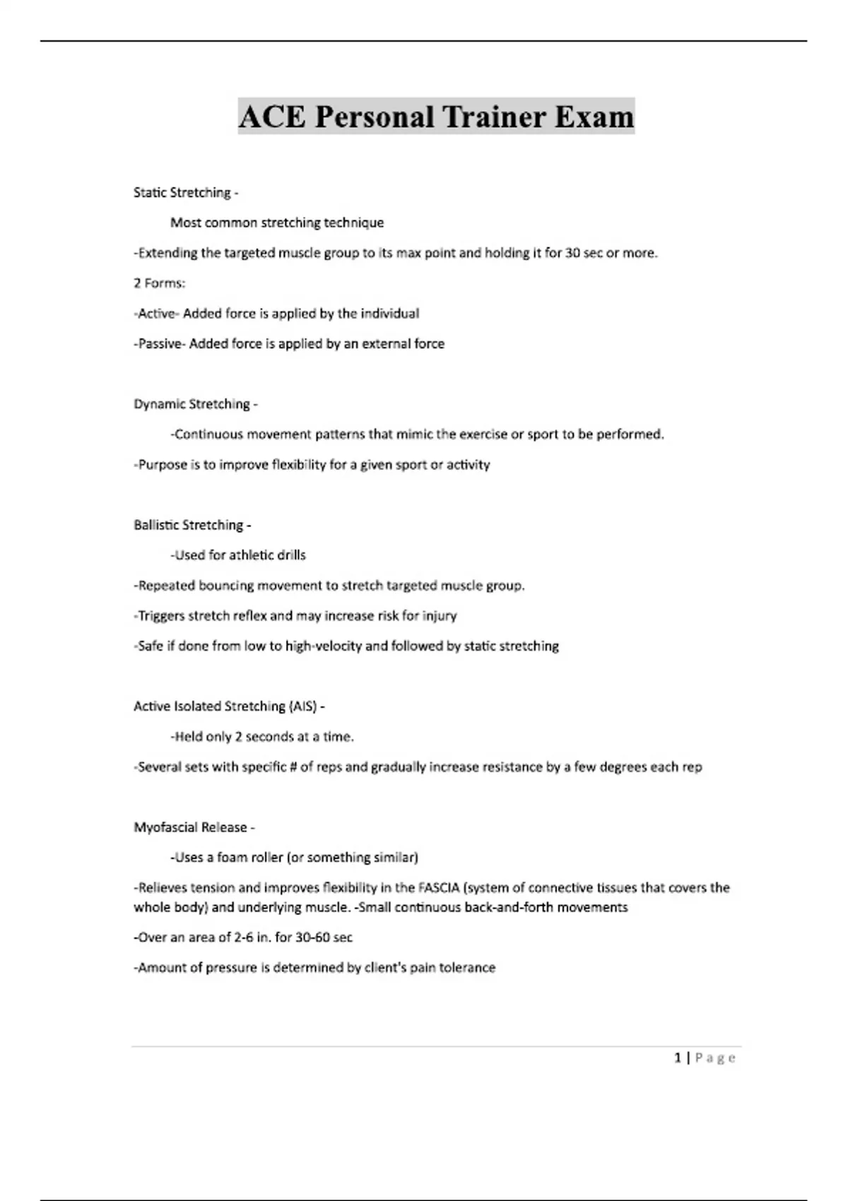 ACE Personal Trainer Exam Static Stretching - Most common stretching technique -Extending the targeted muscle group to its max point and holding it for 30 sec or more. 2 Forms: -Active- Added force is applied by the individual -Passive- Added force is applied by an external force Dynamic Stretching - -Continuous movement patterns that mimic the exercise or sport to be performed. -Purpose is to improve flexibility for a given sport or activity Ballistic Stretching - -Used for athletic drills -Repeated bouncing movement to stretch targeted muscle group. -Triggers stretch reflex and may increase risk for injury -Safe if done from low to high-velocity and followed by static stretching Active Isolated Stretching (AIS) - -Held only 2 seconds at a time. -Several sets with specific # of reps and gradually increase resistance by a few degrees each rep Myofascial Release - -Uses a foam roller (or something similar) -Relieves tension and improves flexibility in the FASCIA (system of connective tissues that covers the whole body) and underlying muscle. -Small continuous back-and-forth movements -Over an area of 2-6 in. for 30-60 sec -Amount of pressure is determined by client's pain tole