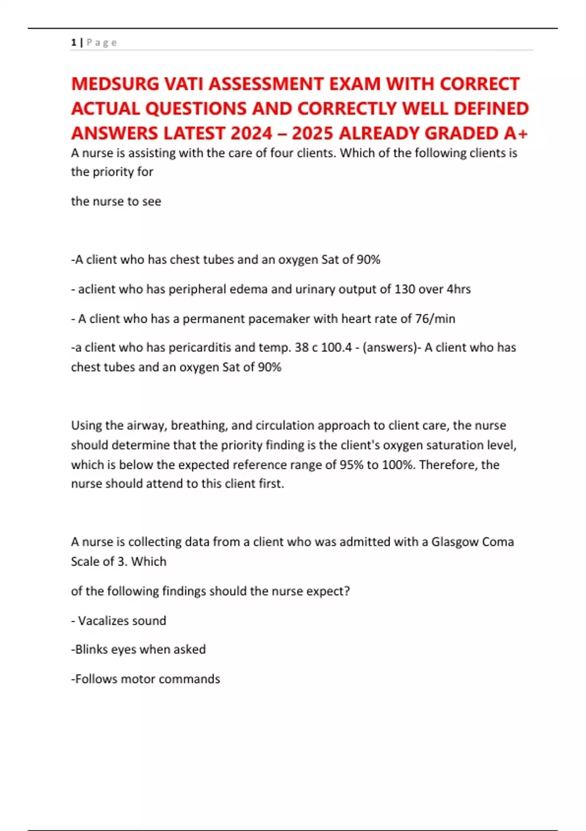 MEDSURG VATI ASSESSMENT EXAM WITH CORRECT