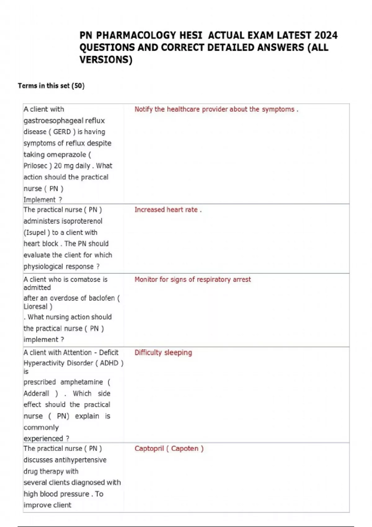 A client with gastroesophageal reflux disease ( GERD ) is having symptoms of reflux despite taking omeprazole ( Prilosec ) 20 mg daily . What action should the practical nurse ( PN ) Implement ? Notify the healthcare provider about the symptoms . The practical nurse ( PN ) administers isoproterenol (Isupel ) to a client with heart block . The PN should evaluate the client for which physiological response ? Increased heart rate . A client who is comatose is admitted after an overdose of baclofen ( Lioresal ) . What nursing action should the practical nurse ( PN ) implement ? Monitor for signs of respiratory arrest A client with Attention - Deficit Hyperactivity Disorder ( ADHD ) is prescribed amphetamine ( Adderall ) . Which side effect should the practical nurse ( PN) explain is commonly experienced ? Difficulty sleeping The practical nurse ( PN ) discusses antihypertensive drug therapy with several clients diagnosed with high blood pressure . To improve client Captopril ( Capoten )