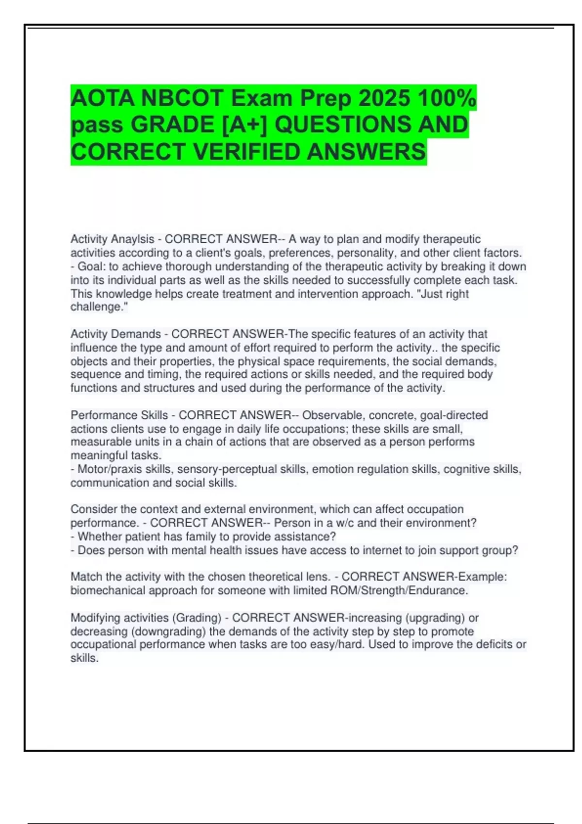 AOTA NBCOT Exam Prep 2025 100% pass GRADE [A+] QUESTIONS AND CORRECT VERIFIED ANSWERS