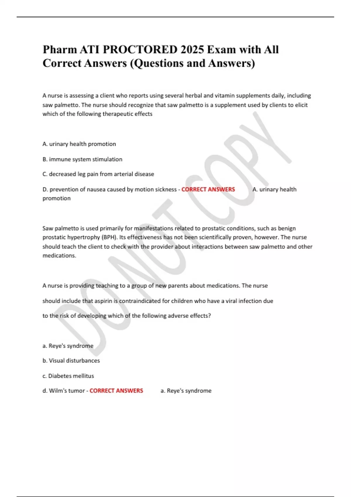 D. prevention of nausea caused by motion sickness - CORRECT ANSWERS A. urinary health