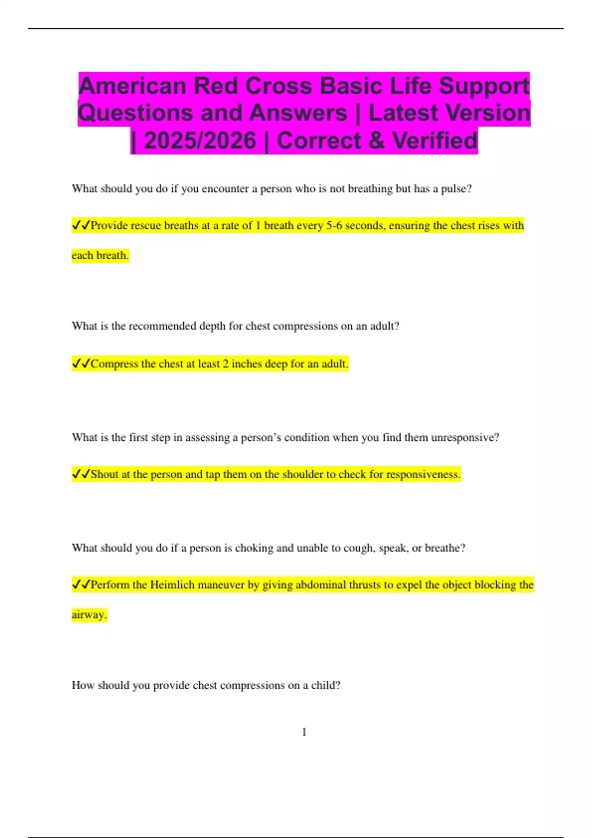 American Red Cross Basic Life Support Questions and Answers | Latest Version | 2025/2026 | Correct & Verified What should you do if you encounter a person who is not breathing but has a pulse? Provide rescue breaths at a rate of 1 breath every 5-6 seconds, ensuring the chest rises with each breath. What is the recommended depth for chest compressions on an adult? Compress the chest at least 2 inches deep for an adult. What is the first step in assessing a person’s condition when you find them unresponsive? Shout at the person and tap them on the shoulder to check for responsiveness. What should you do if a person is choking and unable to cough, speak, or breathe? Perform the Heimlich maneuver by giving abdominal thrusts to expel the object blocking the airway. How should you provide chest compressions on a child? 2 Use one or both hands depending on the child’s size and compress the chest to a depth of about 1/3 the depth of the chest, approximately 2 inches. What should you do if you are alone and find a child in need of CPR? Perform 2 minutes of CPR before calling emergency services if you are alone with a child. What is the correct ratio of chest compressions to rescue breaths for an infant? The ratio is 30 chest compressions to 2 rescue breaths for an infant. What should you do if the person is unresponsive and not breathing but you do not have an AED available? Immediately begin CPR, starting with chest compressions and then providing rescue breaths. What should you do if you encounter a victim of a heart attack who is conscious and complaining of chest pain? Encourage the person to chew and swallow an aspirin if they are not allergic and are able to do so, and call emergency services immediately. How do you check for signs of life in an unresponsive person? 3 Check for breathing by looking at the chest for rise and fall or by feeling for breaths on your cheek. What should you do if an AED advises a shock and the victim has a visible pulse? If an AED advises a shock but the person has a pulse, do not shock them. Continue CPR and reassess. How do you perform CPR on an adult who is pregnant? Perform CPR on a pregnant adult the same way as on any adult, but consider tilting the woman to the left to relieve pressure on the heart. What should you do if the person is unresponsive and breathing abnormally? Place the person in the recovery position to keep the airway open and monitor their breathing until help arrives. When should you stop performing CPR? Stop CPR if the person shows signs of