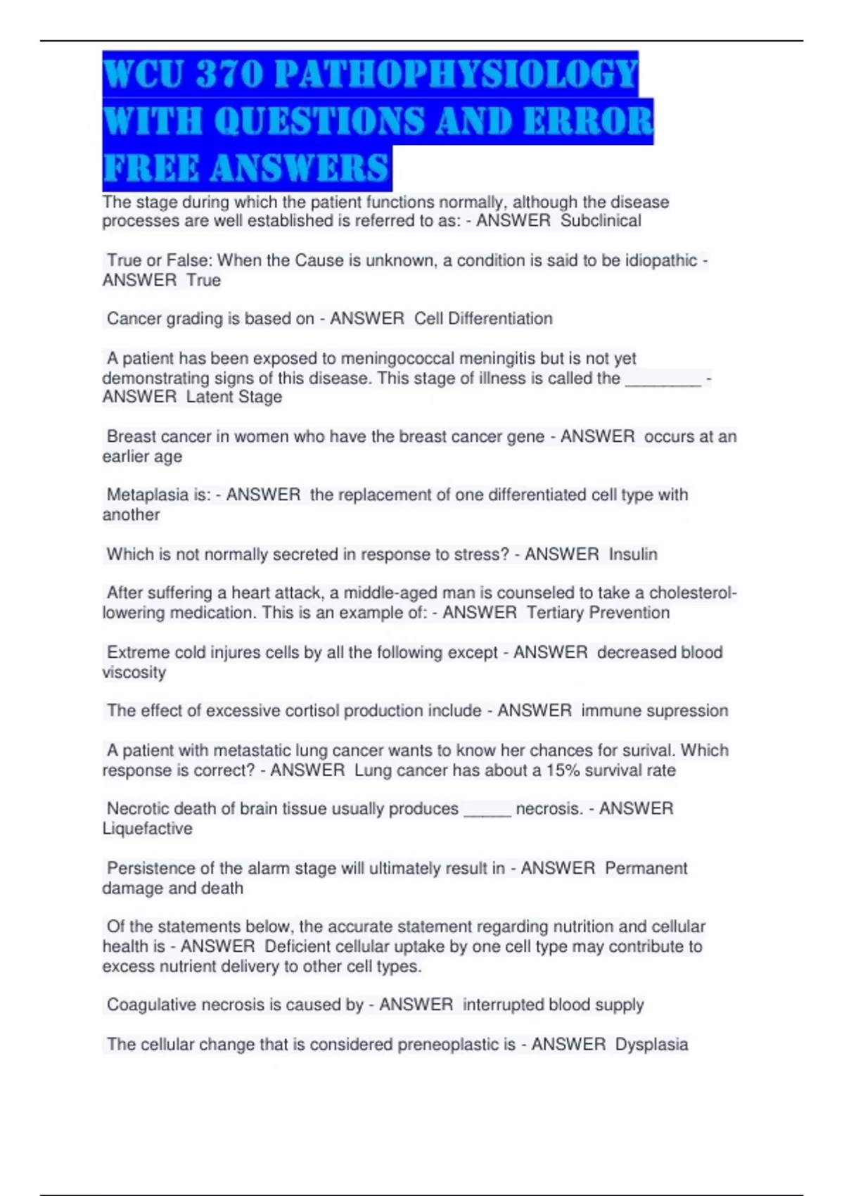 WCU 370 PATHOPHYSIOLOGY WITH QUESTIONS AND ERROR FREE ANSWERS.