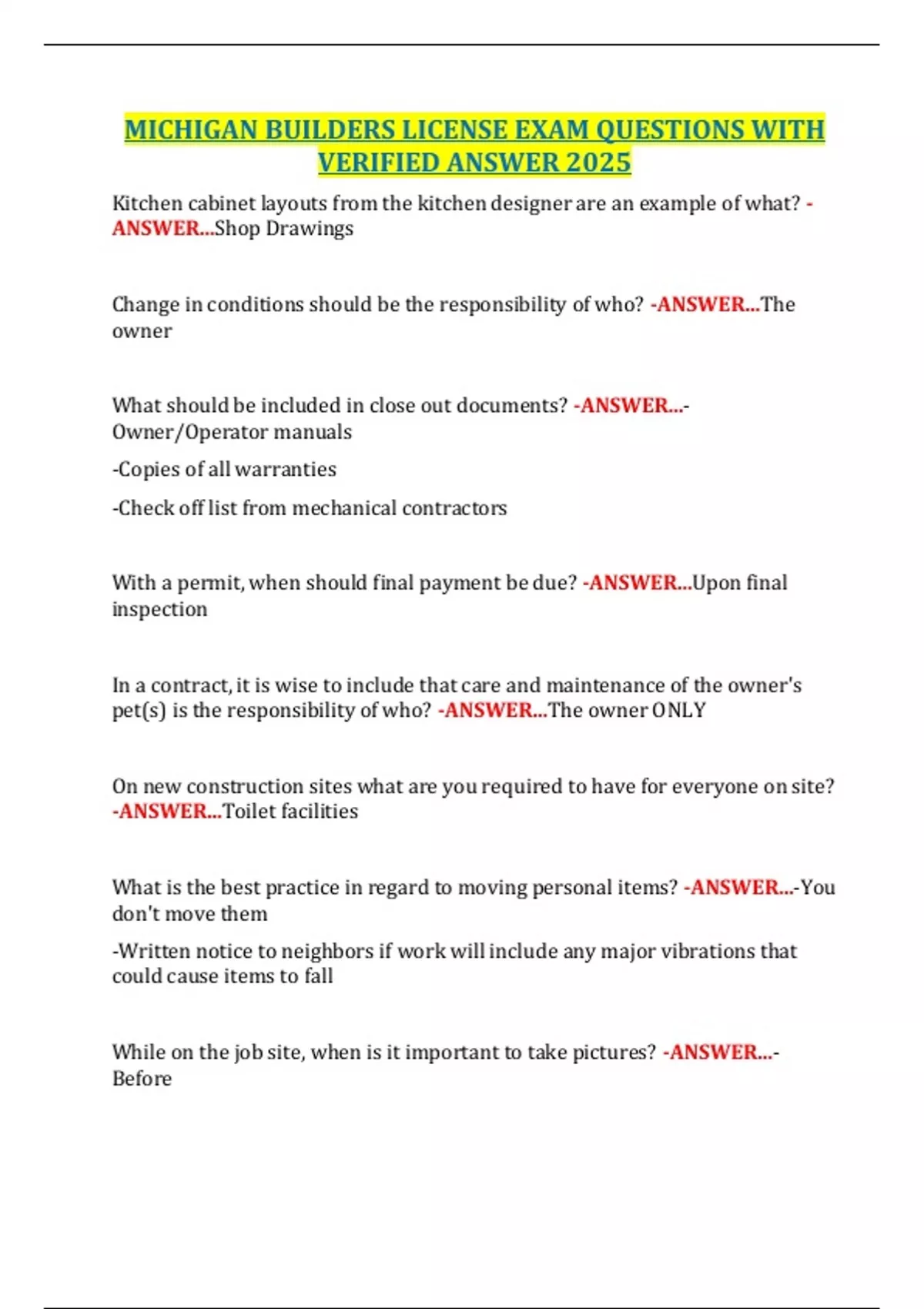 MICHIGAN BUILDERS LICENSE EXAM QUESTIONS WITH VERIFIED ANSWER 2025 Kitchen cabinet layouts from the kitchen designer are an example of what? -ANSWER...Shop Drawings Change in conditions should be the responsibility of who? -ANSWER...The owner What should be included in close out documents? -ANSWER...-Owner/Operator manuals -Copies of all warranties -Check off list from mechanical contractors With a permit, when should final payment be due? -ANSWER...Upon final inspection In a contract, it is wise to include that care and maintenance of the owner's pet(s) is the responsibility of who? -ANSWER...The owner ONLY