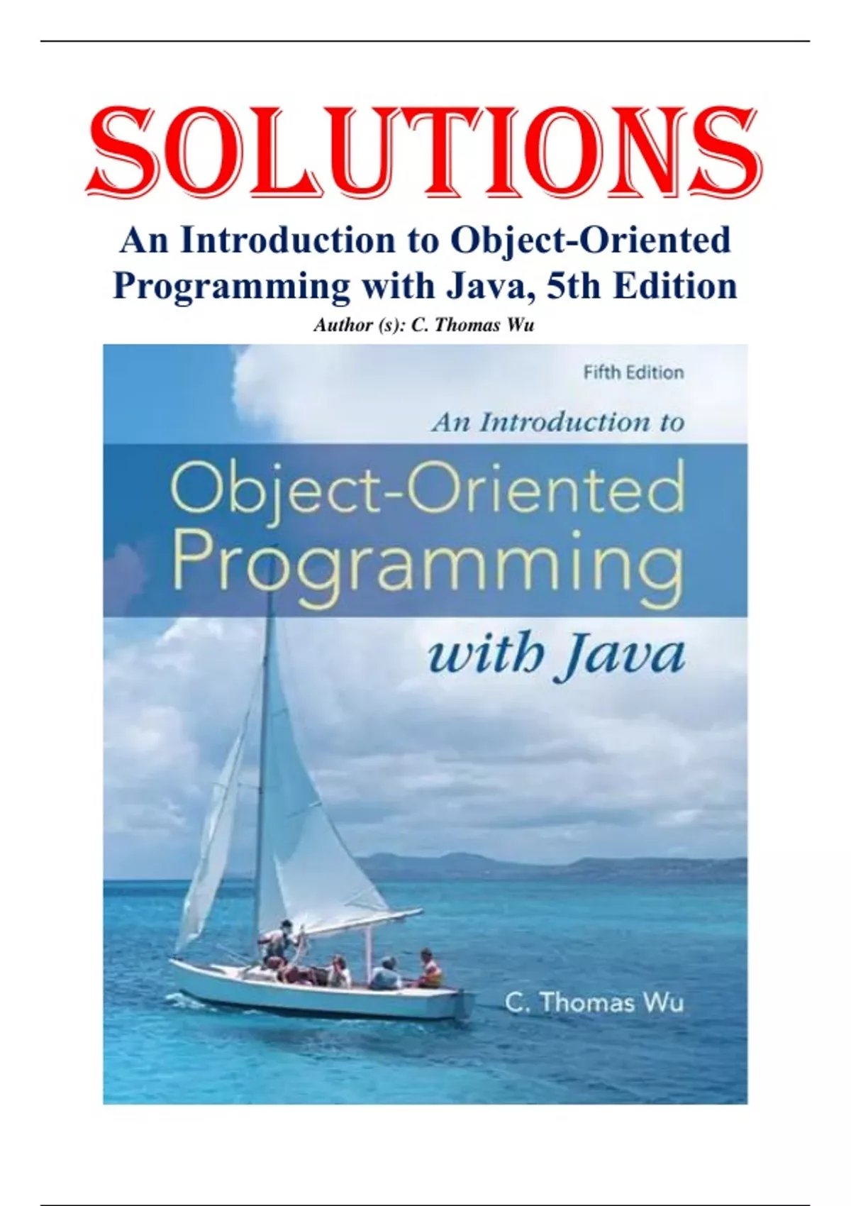 Solutions for An Introduction to Object-Oriented Programming with Java, 5th Edition By C. Thomas Wu. Full Chapters Include;.....Chapter 0 Introduction to Computers and Programming Languages Chapter 1 Introduction to Object-Oriented Programming and Software Development Chapter 2 Getting Started with Java Chapter 3 Numerical Data Chapter 4 Defining Your Own Classes - Part 1 Chapter 5 Selection Statements Chapter 6 Repetition Statements Chapter 7 Defining Your Own Classes - Part 2 Chapter 8 Exceptions and Assertions Chapter 9 Characters and Strings Chapter 10 Arrays and Collections Chapter 11 Sorting and Searching Chapter 12 File Input and Output Chapter 13 Inheritance and Polymorphism Chapter 14 GUI and Event-Driven Programming Chapter 15 Recursive Algorithms