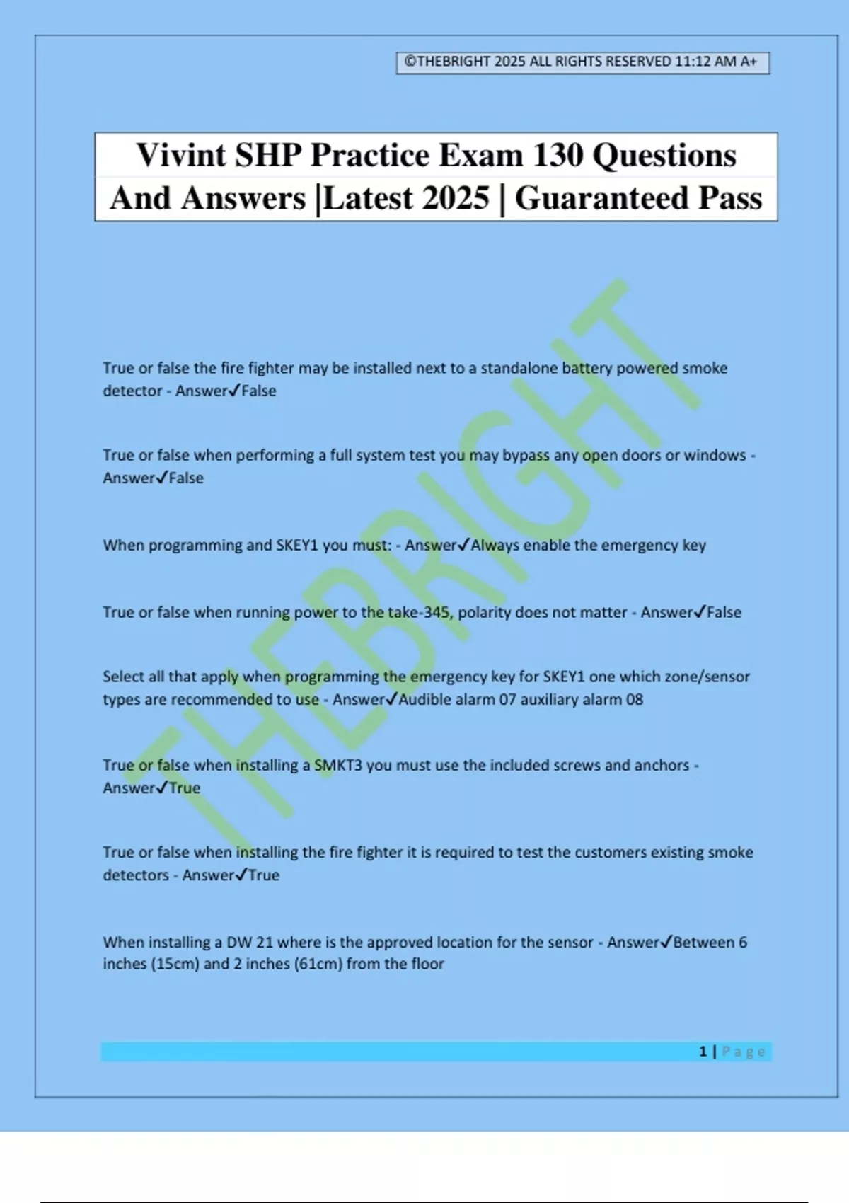 ©THEBRIGHT 2025 ALL RIGHTS RESERVED 11:12 AM A+ 1 | P a g e Vivint SHP Practice Exam 130 Questions And Answers |Latest 2025 | Guaranteed Pass True or false the fire fighter may be installed next to a standalone battery powered smoke detector - AnswerFalse True or false when performing a full system test you may bypass any open doors or windows - AnswerFalse When programming and SKEY1 you must: - AnswerAlways enable the emergency key True or false when running power to the take-345, polarity does not matter - AnswerFalse Select all that apply when programming the emergency key for SKEY1 one which zone/sensor types are recommended to use - AnswerAudible alarm 07 auxiliary alarm 08 True or false when installing a SMKT3 you must use the included screws and anchors - AnswerTrue True or false when installing the fire fighter it is required to test the customers existing smoke detectors - AnswerTrue When installing a DW 21 where is the approved location for the sensor - AnswerBetween 6 inches (15cm) and 2 inches (61cm) from th