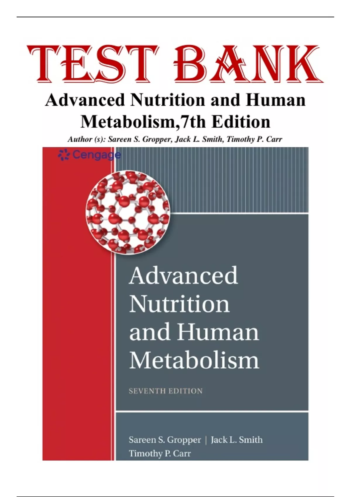 Test Bank for Advanced Nutrition and Human Metabolism, 7th Edition by Gropper. Full Chapters include;....SECTION I: CELLS AND THEIR NOURISHMENT. 1. The Cell: A Microcosm of Life. 2. The Digestive System: Mechanism for Nourishing the Body. SECTION II: MACRONUTRIENTS AND THEIR METABOLISM. 3. Carbohydrates. 4. Fiber. 5. Lipids. 6. Protein. 7. Integration and Regulation of Metabolism and the Impact of Exercise. 8. Energy Expenditure, Body Composition and Healthy Weight. SECTION III: THE REGULATORY NUTRIENTS. 9. The Water-Soluble Vitamins. 10. The Fat-Soluble Vitamins. 11. Major Minerals. 12. Water and Electrolytes. 13. Essential Trace and Ultratrace Minerals. 14. Nonessential Trace and Ultratrace Minerals.