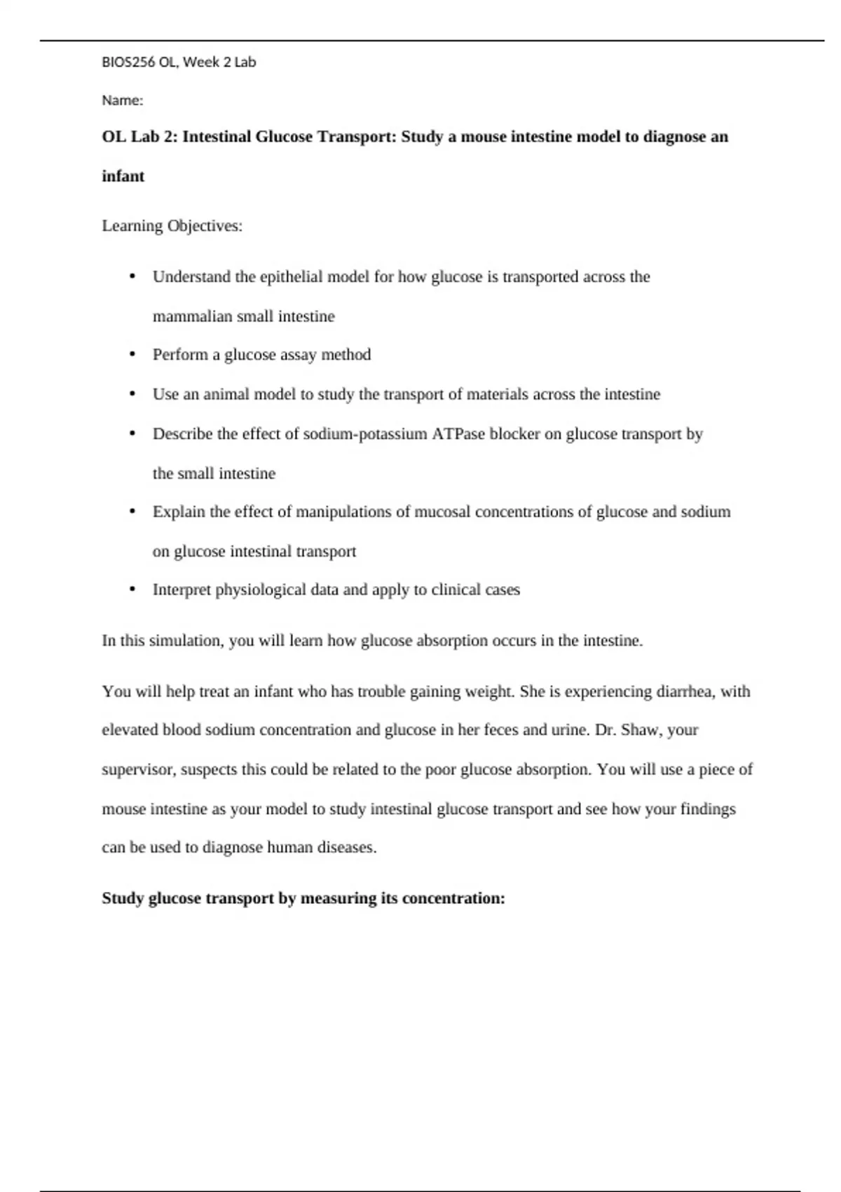 BIOS 256 OL Lab 2: Intestinal Glucose Transport: Study a mouse intestine model to diagnose an infant