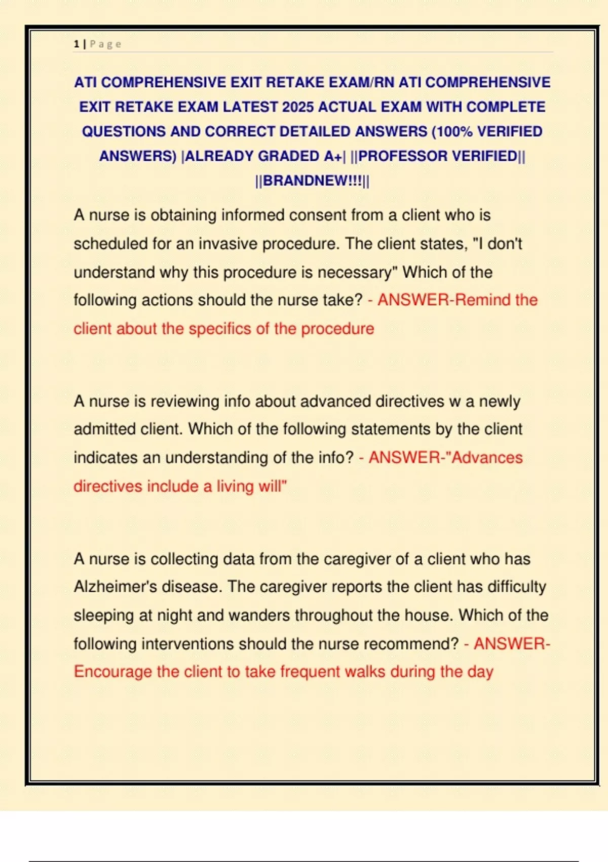 ATI COMPREHENSIVE EXIT RETAKE EXAM/RN ATI COMPREHENSIVE EXIT RETAKE EXAM LATEST 2025 ACTUAL EXAM WITH COMPLETE QUESTIONS AND CORRECT DETAILED ANSWERS (100% VERIFIED ANSWERS) |ALREADY GRADED A+| ||PROFESSOR VERIFIED|| ||BRANDNEW!!!||