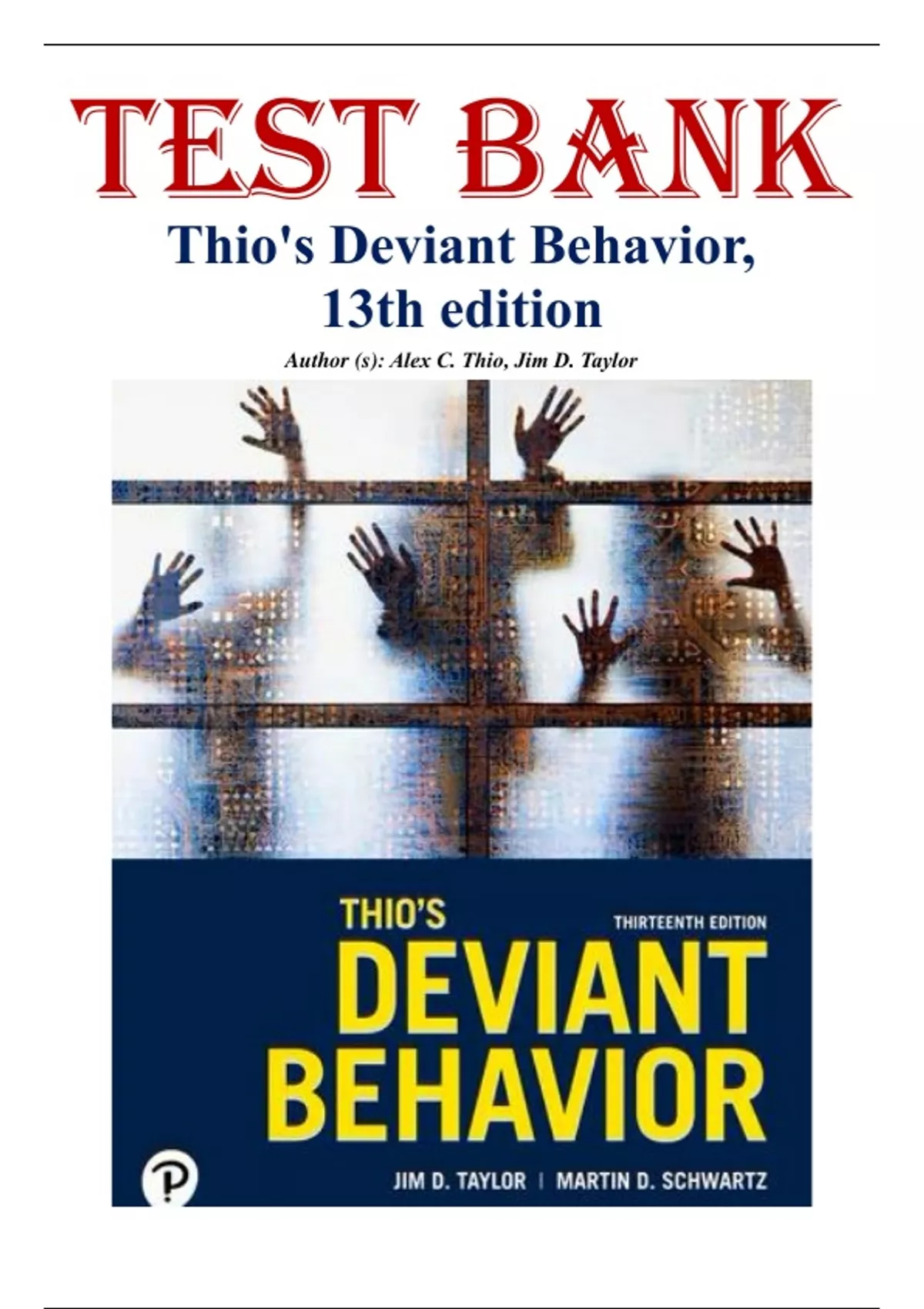 Test Bank for Thio's Deviant Behavior, 13th edition by Alex C. Thio. Full Chapters Include;....What Is Deviant Behavior? Positivist Theories Constructionist Theories Physical Violence Sexual Assault and Child Molestation Family Violence Suicide and Self-Injury Mental Disorder Heterosexual Deviance Gay People and Other Targets of Stigma Internet Deviance Drug Use Drinking and Alcoholism Privileged Deviance Underprivileged Deviance