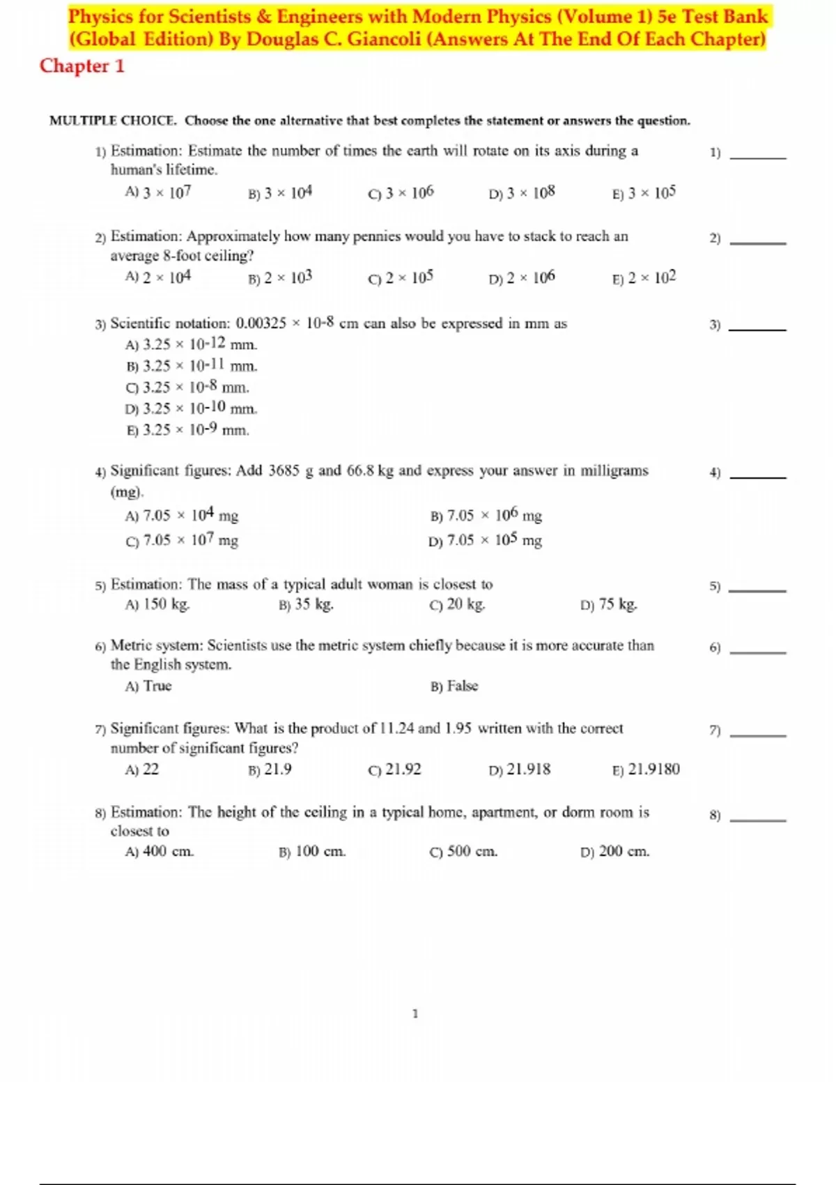 Test Bamk for Physics for Scientists & Engineers, 5th edition by Douglas C. Giancoli (Volume 1: Chapters 1-20). Full Chapters Include;.....Introduction, Measurement, Estimating 1.1 How Science Works 1.2 Models, Theories, and Laws 1.3 Measurement and Uncertainty; Significant Figures 1.4 Units, Standards, and the SI System 1.5 Converting Units 1.6 Order of Magnitude: Rapid Estimating *1.7 Dimensions and Dimensional Analysis Describing Motion: Kinematics in One Dimension 2.1 Reference Frames and Displacement 2.2 Average Velocity 2.3 Instantaneous Velocity 2.4 Acceleration 2.5 Motion at Constant Acceleration 2.6 Solving Problems 2.7 Freely Falling Objects *2.8 Variable Acceleration; Integral Calculus Kinematics in Two or Three Dimensions; Vectors 3.1 Vectors and Scalars 3.2 Addition of Vectors--Graphical Methods 3.3 Subtraction of Vectors, and Multiplication of a Vector by a Scalar 3.4 Adding Vectors by Components 3.5 Unit Vectors 3.6 Vector Kinematics 3.7 Projectile Motion 3.8 Solving Problems Involving Projectile Motion 3.9 Relative Velocity Dynamics: Newton's Laws of Motion 4.1 Force 4.2 Newton's First Law of Motion 4.3 Mass 4.4 Newton's Second Law of Motion 4.5 Newton's Third Law of Motion 4.6 Weight--the Force of Gravity; and the Normal Force 4.7 Solving Problems with Newton's Laws: Free-Body Diagrams 4.8 Problem Solving--A General Approach Using Newton's Laws: Friction, Circular Motion, Drag Forces 5.1 Using Newton's Laws with Friction 5.2 Uniform Circular Motion--Kinematics 5.3 Dynamics of Uniform Circular Motion 5.4 Highway Curves: Banked and Unbanked 5.5 Nonuniform Circular Motion *5.6 Velocity-Dependent Forces: Drag and Terminal Velocity Gravitation and Newton's Synthesis 6.1 Newton's Law of Universal Gravitation 6.2 Vector Form of Newton's Law of Universal Gravitation 6.3 Gravity Near the Earth's Surface 6.4 Satellites and
