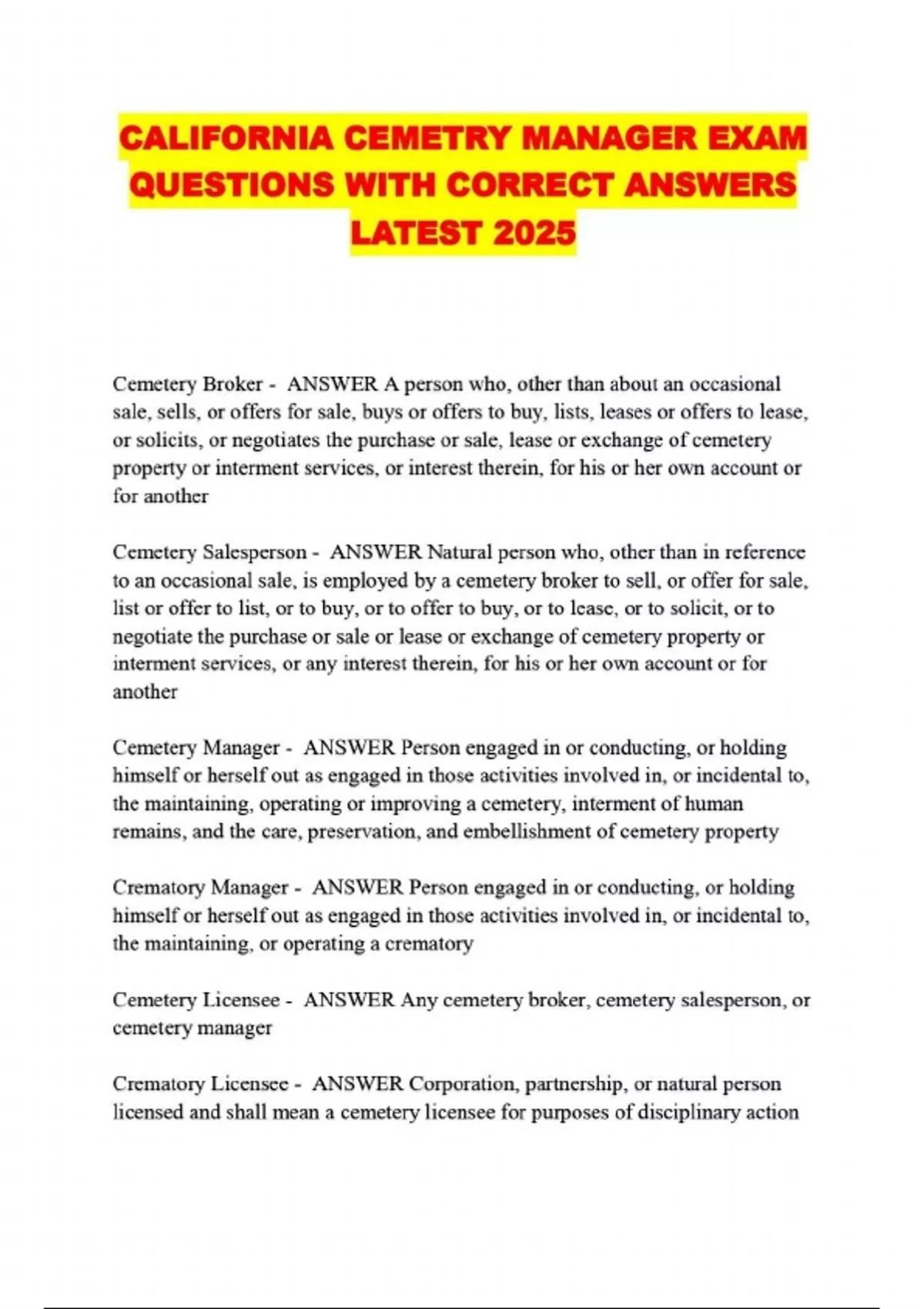 CALIFORNIA CEMETERY MANAGER EXAM QUESTIONS WITH CORRECT ANSWERS LATEST 2025...