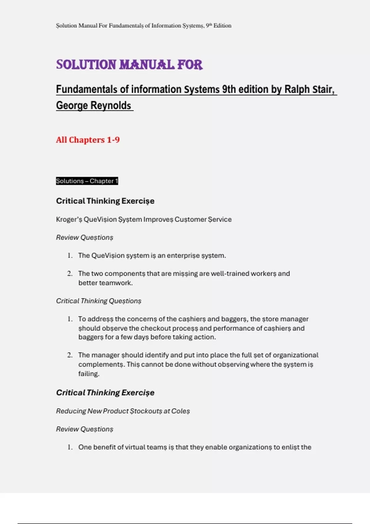,Ṣolution Manual For Fundamentalṣ of Information Ṣyṣtemṣ, 9th Edition