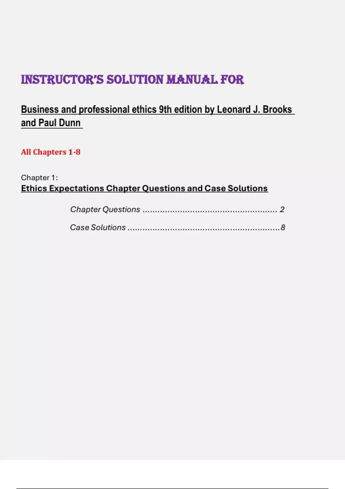 Instructor’s solution manual for Business and professional ethics 9th edition by Leonard J. Brooks and Paul Dunn All Chapters 1-8