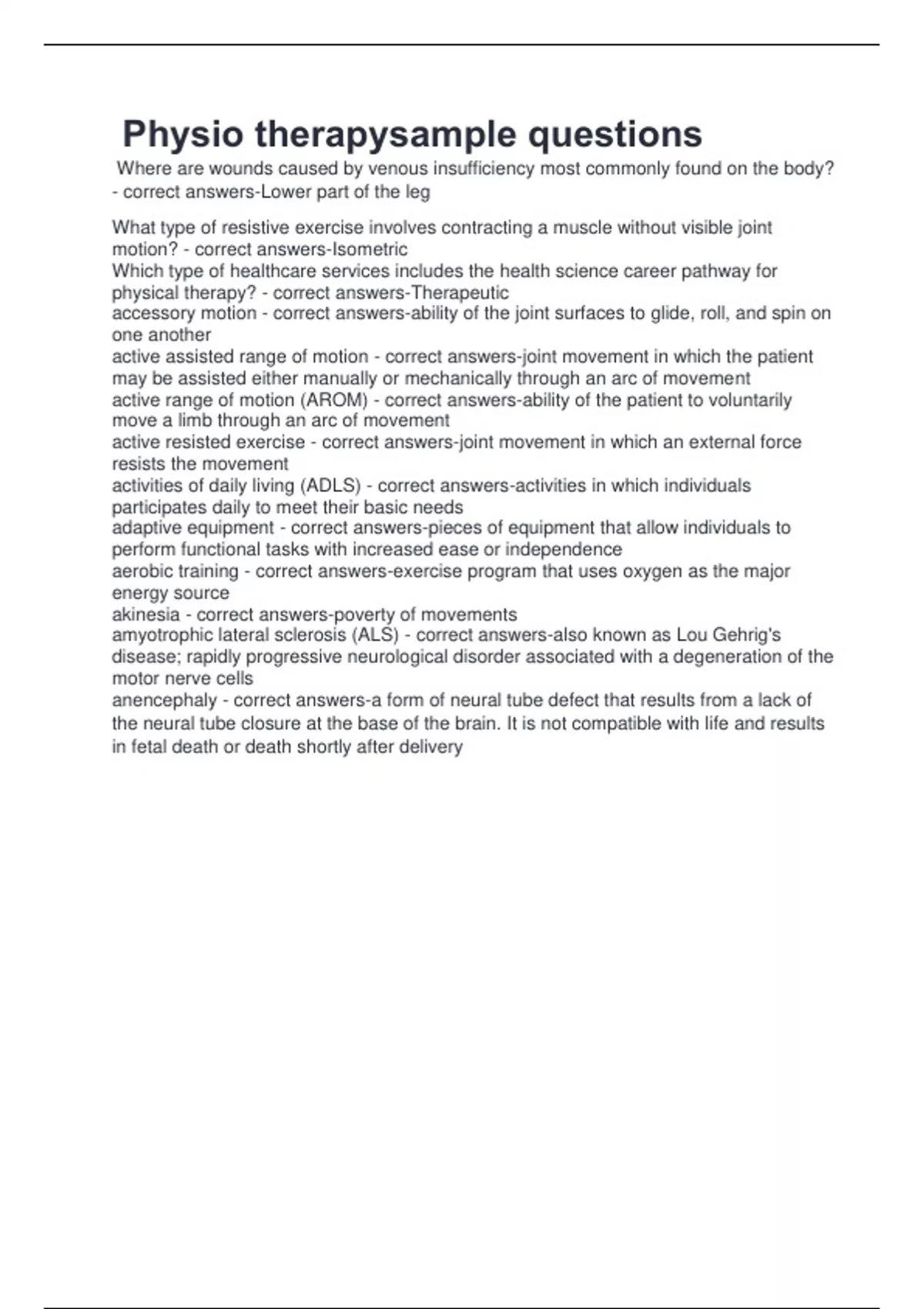 activities of daily living (ADLS) - correct answers-activities in which individuals participates daily to meet their basic needs adaptive equipment - correct answers-pieces of equipment that allow individuals to perform functional tasks with increased ease or independence aerobic training - correct answers-exercise program that uses oxygen as the major energy source akinesia - correct answers-poverty of movements amyotrophic lateral sclerosis (ALS) - correct answers-also known as Lou Gehrig's disease; rapidly progressive neurological disorder associated with a degeneration of the motor nerve cells anencephaly - correct answers-a form of neural tube defect that results from a lack of the neural tube closure at the base of the brain. It is not compatible with life and results in fetal death or death shortly after delivery