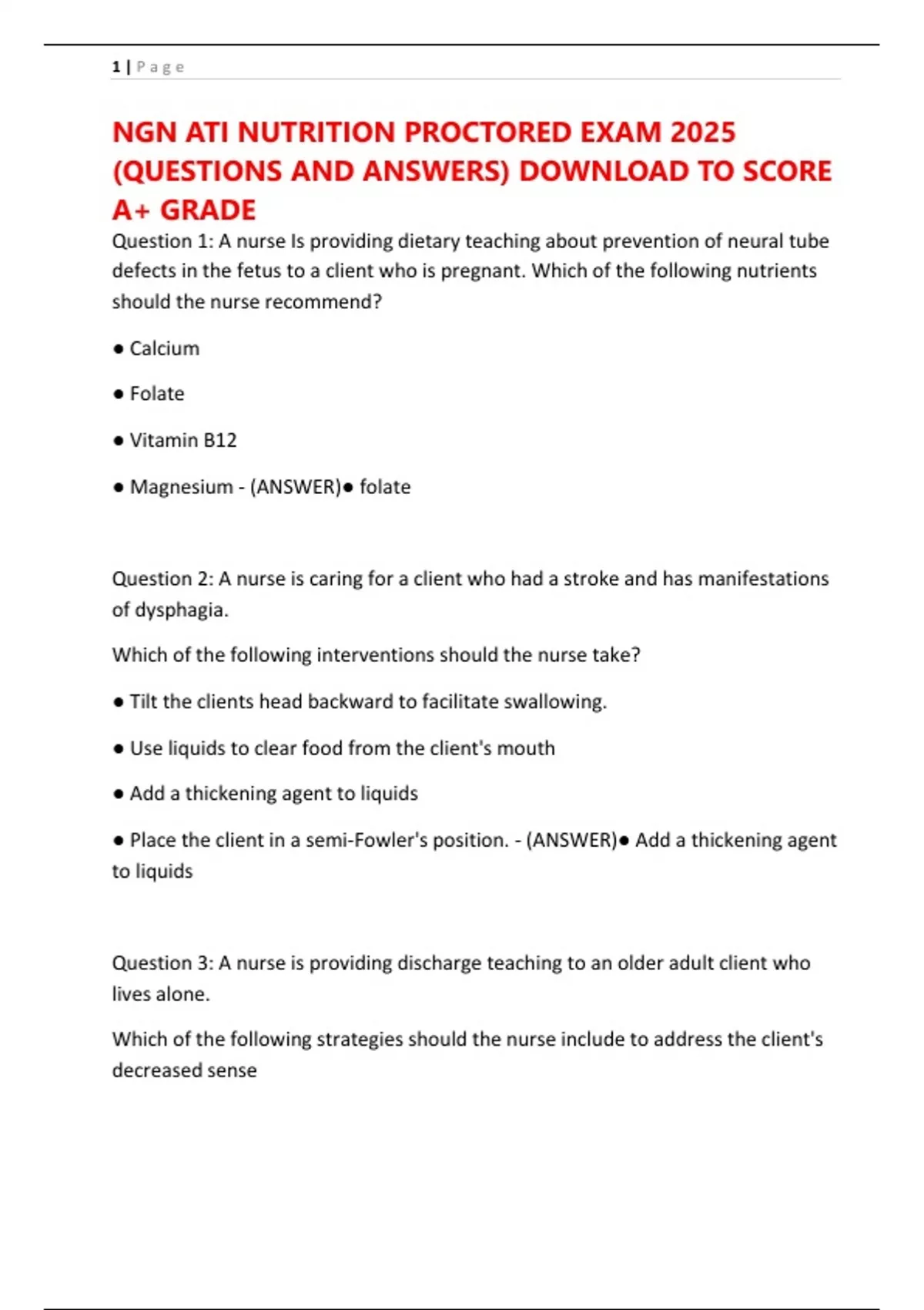 NGN ATI NUTRITION PROCTORED EXAM 2025 (QUESTIONS AND ANSWERS) DOWNLOAD TO SCORE A+ GRADE