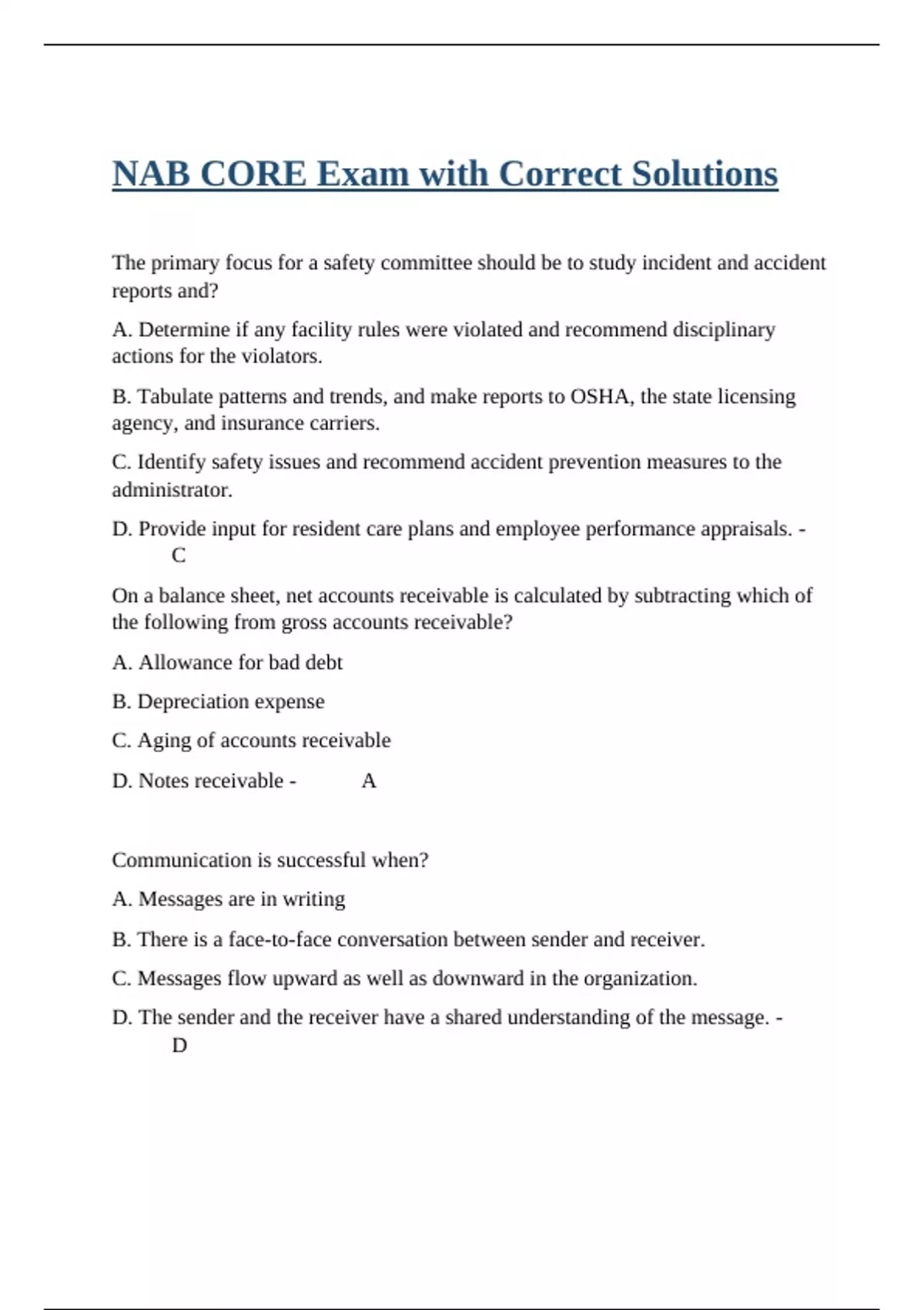 The primary focus for a safety committee should be to study incident and accident reports and? A. Determine if any facility rules were violated and recommend disciplinary actions for the violators. B. Tabulate patterns and trends, and make reports to OSHA, the state licensing agency, and insurance carriers. C. Identify safety issues and recommend accident prevention measures to the administrator. D. Provide input for resident care plans and employee performance appraisals. - C On a balance sheet, net accounts receivable is calculated by subtracting which of the following from gross accounts receivable? A. Allowance for bad debt B. Depreciation expense C. Aging of accounts receivable D. Notes receivable - A Communication is successful when? A. Messages are in writing B. There is a face-to-face conversation between sender and receiver. C. Messages flow upward as well as downward in the organization. D. The sender and the receiver have a shared understanding of the message. - D When a client is having a seizure, the care-giver should? A. Hold down the person. B. Cushion the person's head and loosen tight clothing around the neck. C. Put the person's anti-seizure medicine in his mouth. D. Roll the person on his or her back to prevent choking or vomiting. - B Which of the following is not a desirable step in the employee disciplinary process? A. Making it clear how the employee's performance or behavior failed to meet expectations. B. Making a written record of oral warnings for placement in the employee's personnel file. C. Including a period of suspension, as well as an investigation, as parts of any disciplinary action. D. Giving the employee an opportunity to explain or defend their performance. - C The Fair Labor Standards Act does not include? A. Rights and restrictions on collective bargaining by labor unions. B. Requirements for overtime pay. C. A nationwide minimum wage. D. Limitations on the hiring of children. - A Organizational characteristics that might increase the risk for staff-on-customer abuse include all except which one of the following? A. Chronic staffing shortages B. Stressful working conditions C. Poor training for care-giving responsibilities D. Use of volunteers in the activity program - D