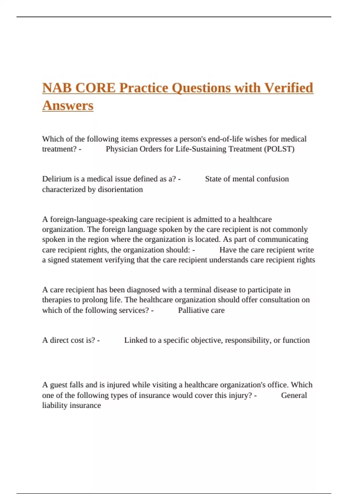 Which of the following items expresses a person's end-of-life wishes for medical treatment? - Physician Orders for Life-Sustaining Treatment (POLST) Delirium is a medical issue defined as a? - State of mental confusion characterized by disorientation A foreign-language-speaking care recipient is admitted to a healthcare organization. The foreign language spoken by the care recipient is not commonly spoken in the region where the organization is located. As part of communicating care recipient rights, the organization should: - Have the care recipient write a signed statement verifying that the care recipient understands care recipient rights A care recipient has been diagnosed with a terminal disease to participate in therapies to prolong life. The healthcare organization should offer consultation on which of the following services? - Palliative care A direct cost is? - Linked to a specific objective, responsibility, or function A guest falls and is injured while visiting a healthcare organization's office. Which one of the following types of insurance would cover this injury? - General liability insurance When the actual supply cost substantially exceeds the expected cost, the administrator should initially: - Investigate probable breach of security Which type of financial statement is derived from analysis of other statements and has more detail on financial activity? - Profit and loss Most often a third-party payer, such as a Medicaid or a long-term insurer, will negotiate a lower rate for services rendered. The difference of funds that is uncollectables between the full charges and the amount that is actually paid by a third party payer is called? - Contractual allowances If overall revenue declines and census remains stable, an important financial area to review would be? - Ancillary revenue A healthcare organization has just purchased equipment for a total cost of $15,000. The equipment has a useful life of five years and the administrator is planning to charge a depreciation expense of $3,000 per year. Which depreciation method is being used? - Straight-line depreciation Utilizing the FIFO inventory method, which supply would be used last? Supply A 12/1/2016 Supply B 12/20/2016 Supply C 1/4/2017 Supply D 2/3/2017 - Supply A Which of the following best describes a primary difference between a not-for-profit and a for-profit organization? - A for-profit organization may distribute profits to its shareholders The LIFO and FIFO methods of inventory costing both accounts for the effects of which of the following factors on the price of inventory? - Depreciation. The operating performance for a specific span of time is measured by the: - Income statement
