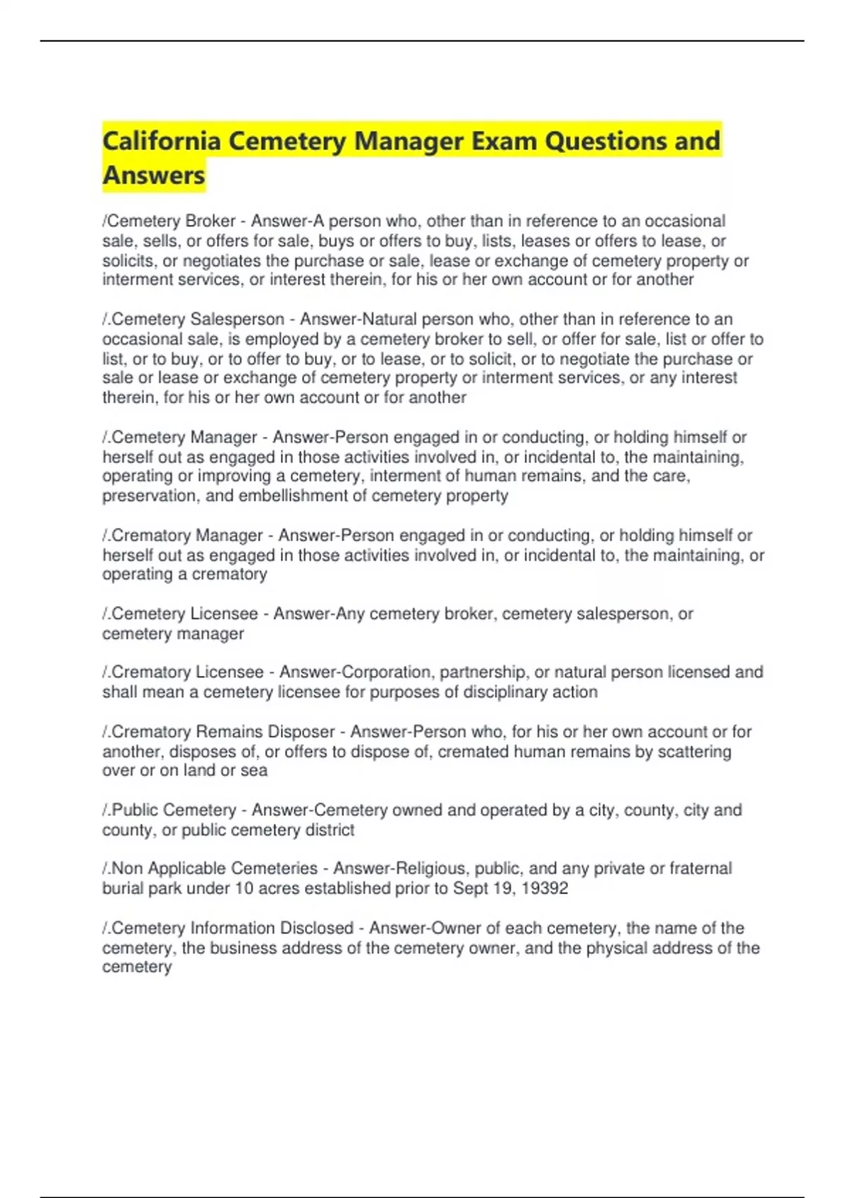 California Cemetery Manager Exam Questions and Answers /Cemetery Broker - Answer-A person who, other than in reference to an occasional sale, sells, or offers for sale, buys or offers to buy, lists, leases or offers to lease, or solicits, or negotiates the purchase or sale, lease or exchange of cemetery property or interment services, or interest therein, for his or her own account or for another /.Cemetery Salesperson - Answer-Natural person who, other than in reference to an occasional sale, is employed by a cemetery broker to sell, or offer for sale, list or offer to list, or to buy, or to offer to buy, or to lease, or to solicit, or to negotiate the purchase or sale or lease or exchange of cemetery property or interment services, or any interest therein, for his or her own account or for another /.Cemetery Manager - Answer-Person engaged in or conducting, or holding himself or herself out as engaged in those activities involved in, or incidental to, the maintaining, operating or improving a cemetery, interment of human remains, and the care, preservation, and embellishment of cemetery property /.Crematory Manager - Answer-Person engaged in or conducting, or holding himself or herself out as engaged in those activities involved in, or incidental to, the maintaining, or operating a crematory /.Cemetery Licensee - Answer-Any cemetery broker, cemetery salesperson, or cemetery manager /.Crematory Licensee - Answer-Corporation, partnership, or natural person licensed and shall mean a cemetery licensee for purposes of disciplinary action /.Crematory Remains Disposer - Answer-Person who, for his or her own account or for another, disposes of, or offers to dispose of, cremated human remains by scattering over or on land or sea /.Public Cemetery - Answer-Cemetery owned and operated by a city, county, city and county, or public cemetery district /.Non Applicable Cemeteries - Answer-Religious, public, and any private or fraternal burial park under 10 acres established prior to Sept 19, 19392 /.Cemetery Information Disclosed - Answer-Owner of each cemetery, the name of the cemetery, the business address of the cemetery owner, and the physical address of the cemetery /.Employees with License Issues - Answer-Manager shall inform bureau within 30 days of being informed of any employee with a previous license that has been revoked, suspended, on probation, or surrendered /.Annual Cemetery Report - Answer-On or before June 1, or within five months after close of their fiscal year including number of square feet of grave space and the number of crypts and niches sold or disposed of under endowment care, amount deposited in endowment care fund, statement showing separately the total amount of general and special endowment care funds, and use of endowment care funds /.Annual Audit Report - Answer-Signed by CPA or public accountant, includes inspection, review, and audit of the general purpose financial statements of the endowment care fund and special care fund, which shall include the balance sheet, the statement of revenues, expenditures, and changes in fund balance. 30 day extension possible. Change in trustee must be reports within 30 days. Change from calendar to fiscal reporting as long as reporting period does not exceed one year. Filed with county clerk. /.Annual Audit Penalties - Answer-$400 fine per month (up to 5 months) for a late report. Failure to pay within 15 days shall be cause for disciplinary action. /.Endowment Care Examination - Answer-At least once every five years and as deemed necessary, when cemetery authority fails to file report required, when the accountant or auditor qualifies his or her certification of the report. Examination paid for by cemetery authority or face revocation. /.Examination Details - Answer-Bureau shall have free access to the books and records relating to trust funds and expenditures of the funds /.Limited Liability Company - Answer-No licensee shall have ownership interest as a member in a limited liability company certificated as a cemetery authority. /.Endowment Care Control - Answer-Bureau may administer oaths, inadequate funds may require bureau to enforce rules, reinvest funds in conformity with code. Superior court of the county of principal office shall force receivership (may be due to embezzled or wrongfully diverted fund). Costs of any actions can be taken from available income from any endowment care fund. Bureau to become custodian of funds /.Preneed Disclosure - Answer-Every cemetery authority shall present to the survivor of the deceased who is handling the burial or cremation arrangements or the responsible party a copy of any preneed agreement that has been signed and paid in full, or in part, by or on behalf of the deceased and is in the possession of the cemetery authority. Penalty three times the cost of the preneed of $1,000, whichever is greater. /.Contract Requirements - Answer-Must have Bureau contact info on first page of any sale contract in 8-point boldface type