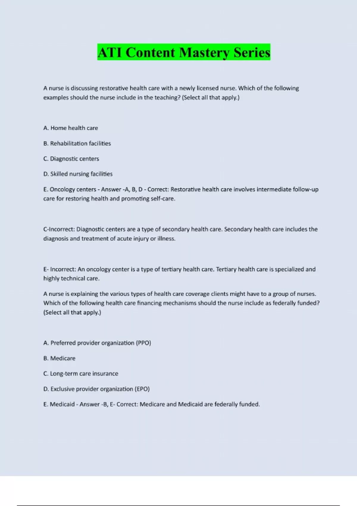 ATI Content Mastery Series A nurse is discussing restorative health care with a newly licensed nurse. Which of the following examples should the nurse include in the teaching? (Select all that apply.) A. Home health care B. Rehabilitation facilities C. Diagnostic centers D. Skilled nursing facilities E. Oncology centers - Answer -A, B, D - Correct: Restorative health care involves intermediate follow-up care for restoring health and promoting self-care. C-Incorrect: Diagnostic centers are a type of secondary health care. Secondary health care includes the diagnosis and treatment of acute injury or illness. E- Incorrect: An oncology center is a type of tertiary health care. Tertiary health care is specialized and highly technical care. A nurse is explaining the various types of health care coverage clients might have to a group of nurses. Which of the following health care financing mechanisms should the nurse include as federally funded? (Select all that apply.) A. Preferred provider organization (PPO) B. Medicare C. Long-term care insurance D. Exclusive provider organization (EPO) E. Medicaid - Answer -B, E- Correct: Medicare and Medicaid are federally funded. A, C, D - Incorrect: PPOs, Long-term care insurance, and EPOs are privately funded. A nurse manager is developing strategies to care for the increasing number of clients who have obesity. Which of the following actions should the nurse include as a primary health care strategy? A. Collaborating with providers to perform obesity screenings during routine office visits. B. Ensuring the availability of specialized beds in rehabilitation centers for clients who have obesity. C. Providing specialized intraoperative training in surgical treatments for obesity. D. Educating acute care nurses about postoperative complications related to obesity. - Answer -A- Correct: Identify obesity screenings at office visits as an example of primary health care. Primary health care emphasizes health promotion and disease control. B- Incorrect: Rehabilitation care is an example of restorative health care. C- Incorrect: Specialized and highly technical care is an example of tertiary health care. D- Incorrect: Acute care is an example of secondary health care. A nurse is discussing the purpose of regulatory agencies during a staff meeting. Which of the following tasks should the nurse identify as the responsibility of state licensing boards? A. Monitoring evidence-based practice for clients who have a specific diagnosis B. Ensuring that health care providers comply with regulations C. Setting quality standards for accreditation of health care facilities D. Determining whether medications are safe for administration to clients - Answer -B- Correct: Identify that state licensing boards are responsible for ensuring that health care providers and agencies comply with state regulations A.- Incorrect: Identify that utilization review committees have the responsibility of monitoring for appropriate diagnosis and treatment according to evidence-based practice. C- Incorrect: Identify that the Joint Commission has the responsibility of setting quality standards for accreditation of health care facilities
