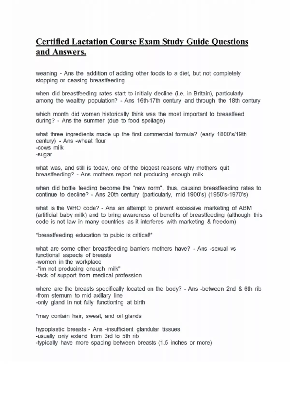 Certified Lactation Course Exam Study Guide Questions and Answers.