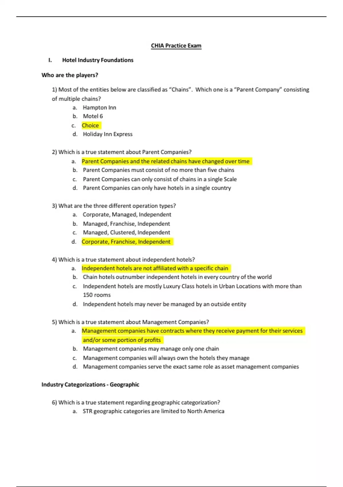 CHIA certification exam questions with correct answers Most of the entities below are classified as "Chains". Which one is a "Parent Company" consisting of multiple chains? a. Hampton Inn b. Motel 6 c. Choice d. Holiday Inn Express - Answer-Choice /.Which is a true statement about Parent Companies? a. Parent Companies and the related chains have changed over time b. Parent Companies must consist of no more than five chains c. Parent Companies can only consist of chains in a single Scale d. Parent Companies can only have hotels in a single country - Answer-A /.What are the three different operation types? a. Corporate, Managed, Independent b. Managed, Franchise, Independent c. Managed, Clustered, Independent d. Corporate, Franchise, Independent - Answer-D /.Which is a true statement about independent hotels? a. Independent hotels are not affiliated with a specific chain b. Chain hotels outnumber independent hotels in every country of the world c. Independent hotels are mostly Luxury Class hotels in Urban Locations with more than 150 rooms d. Independent hotels may never be managed by an outside entity - Answer-A /.Which is a true statement about Management Companies? a. Management companies have contracts where they receive payment for their services and/or some portion of profits b. Management companies may manage only one chain c. Management companies will always own the hotels they manage d. Management companies serve the exact same role as asset management companies - Answer-A /.) Which is a true statement regarding geographic categorization? a. STR geographic categories are limited to North America b. STR uses the UNWTO definitions when it comes to recognizing countries c. General managers of hotels do not need to know geographic categories d. The hotel industry uses seven continents to categorize hotels - Answer-B /.Which is a true statement regarding markets? a. Markets include hotels that are in big cities, not rural areas b. A country would never have more than 100 markets and never have less than 2 markets c. No market will ever cross country boundaries d. There is another name for Markets outside the U.S. - Answer-C /.In descending order of geographic size, which option below is correct? a. Continent, Sub-Continent, Country, Tract/Sub-Market, Market b. Continent, Country, Sub-Continent, Tract/Sub-Market, Market c. Continent, Sub-Continent, Market, Country, Tract/Sub-Market d. Continent, Sub-Continent, Country, Market, Tract/Sub-Market - Answer-D /.Which two geographic categories are the most important for a hotel GM? a. Region and Market b. Market and Tract/Sub-Market c. Region and Tract/Sub-Market d. Country and Tract/Sub-Market - Answer-B /.Markets and tracts are created based on what two determining factors? a. Geographic size and population b. Geographic size and participation c. Number of hotels and participation d. Number of hotels and population - Answer-C /.Which is a true statement regarding Tracts a. Tracts are referred to as Sub-Markets outside of North America b. Tracts are never used to represent a city in rural markets c. Tracts are geographic sub-divisions of a Region d. A country will never have more than 100 Tracts - Answer-A /.Changes to how Markets and Tracts are geographically defined are made how often? a. Monthly b. Annually c. Every five years d. No regular schedule - Answer-B /.Which two non-geographic categories are the most important for a hotel GM? a. Scale and