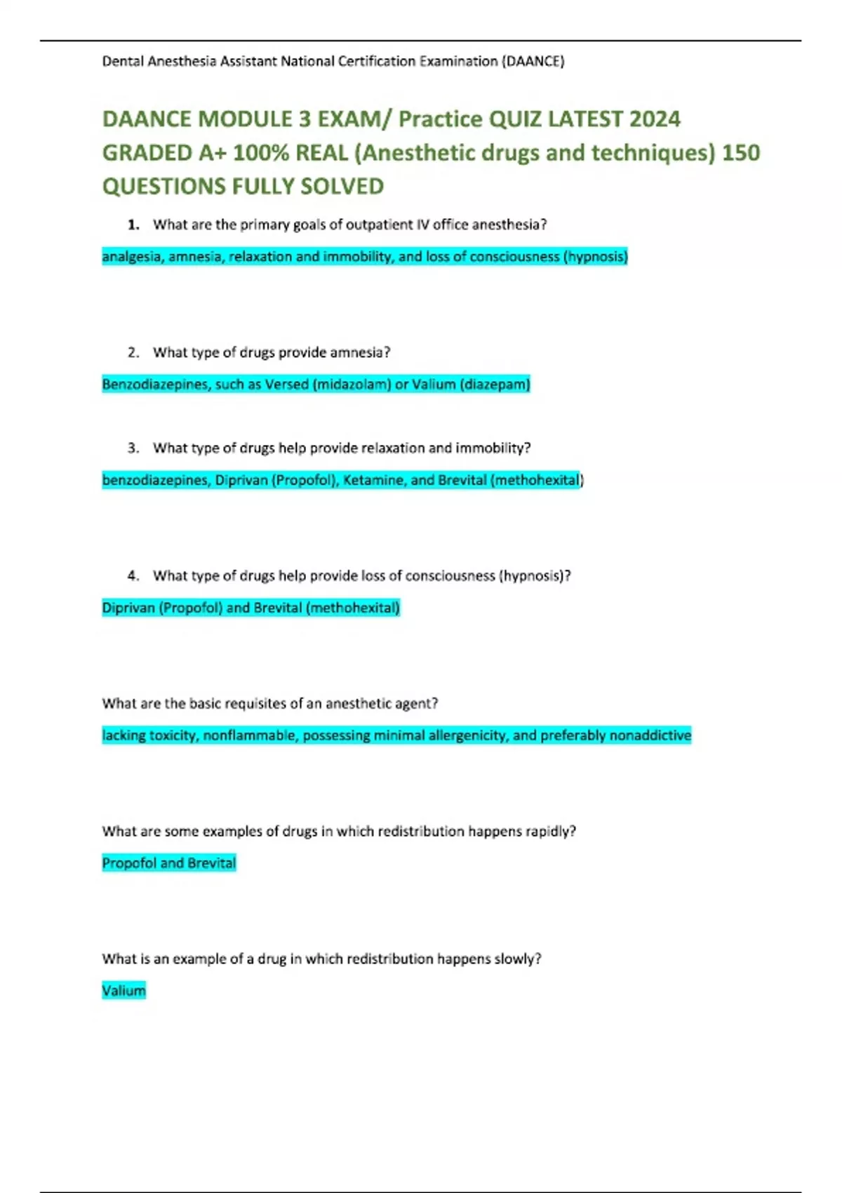 DAANCE MODULE 3 EXAM Practice QUIZ LATEST 2024 / 2025 GRADED A+ 100- REAL (Anesthetic drugs and techniques) 150 QUESTIONS FULLY SOLVED.