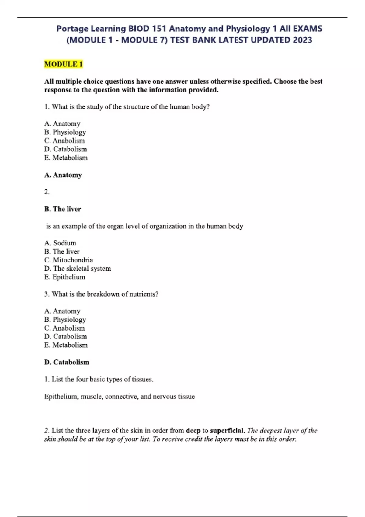 Portage Learning BIOD 151 Anatomy and Physiology 1 All EXAMS (MODULE 1 - MODULE 7) TEST BANK LATEST UPDATED