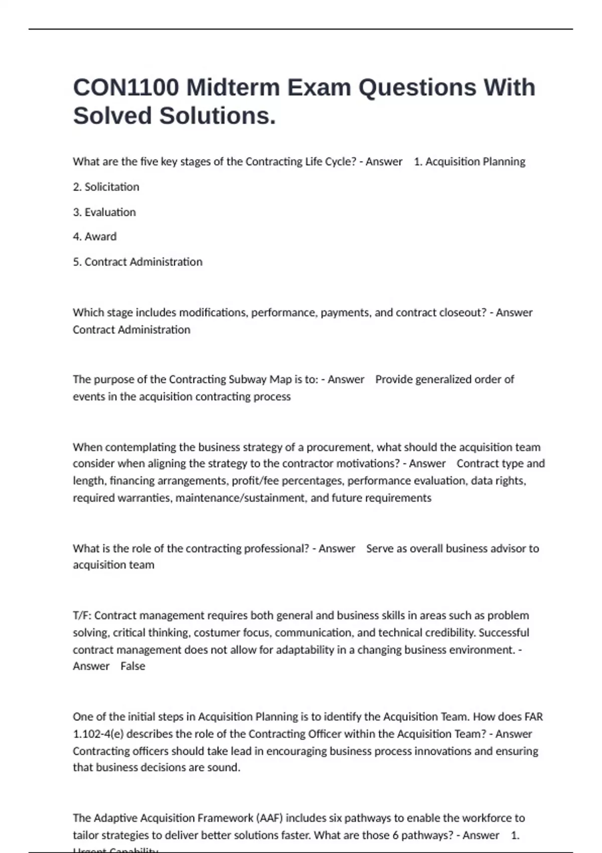 What are the five key stages of the Contracting Life Cycle? - Answer 1. Acquisition Planning 2. Solicitation 3. Evaluation 4. Award 5. Contract Administration Which stage includes modifications, performance, payments, and contract closeout? - Answer Contract Administration The purpose of the Contracting Subway Map is to: - Answer Provide generalized order of events in the acquisition contracting process When contemplating the business strategy of a procurement, what should the acquisition team consider when aligning the strategy to the contractor motivations? - Answer Contract type and length, financing arrangements, profit/fee percentages, performance evaluation, data rights, required warranties, maintenance/sustainment, and future requirements What is the role of the contracting professional? - Answer Serve as overall business advisor to acquisition team T/F: Contract management requires both general and business skills in areas such as problem solving, critical thinking, costumer focus, communication, and technical credibility. Successful contract management does not allow for adaptability in a changing business environment. - Answer False One of the initial steps in Acquisition Planning is to identify the Acquisition Team. How does FAR 1.102-4(e) describes the role of the Contracting Officer within the Acquisition Team? - Answer Contracting officers should take lead in encouraging business process innovations and ensuring that business decisions are sound. The Adaptive Acquisition Framework (AAF) includes six pathways to enable the workforce to tailor strategies to deliver better solutions faster. What are those 6 pathways? - Answer 1. Urgent Capability 2. Middle Tier DoD 3. Major Capability 4. Software Acquisition
