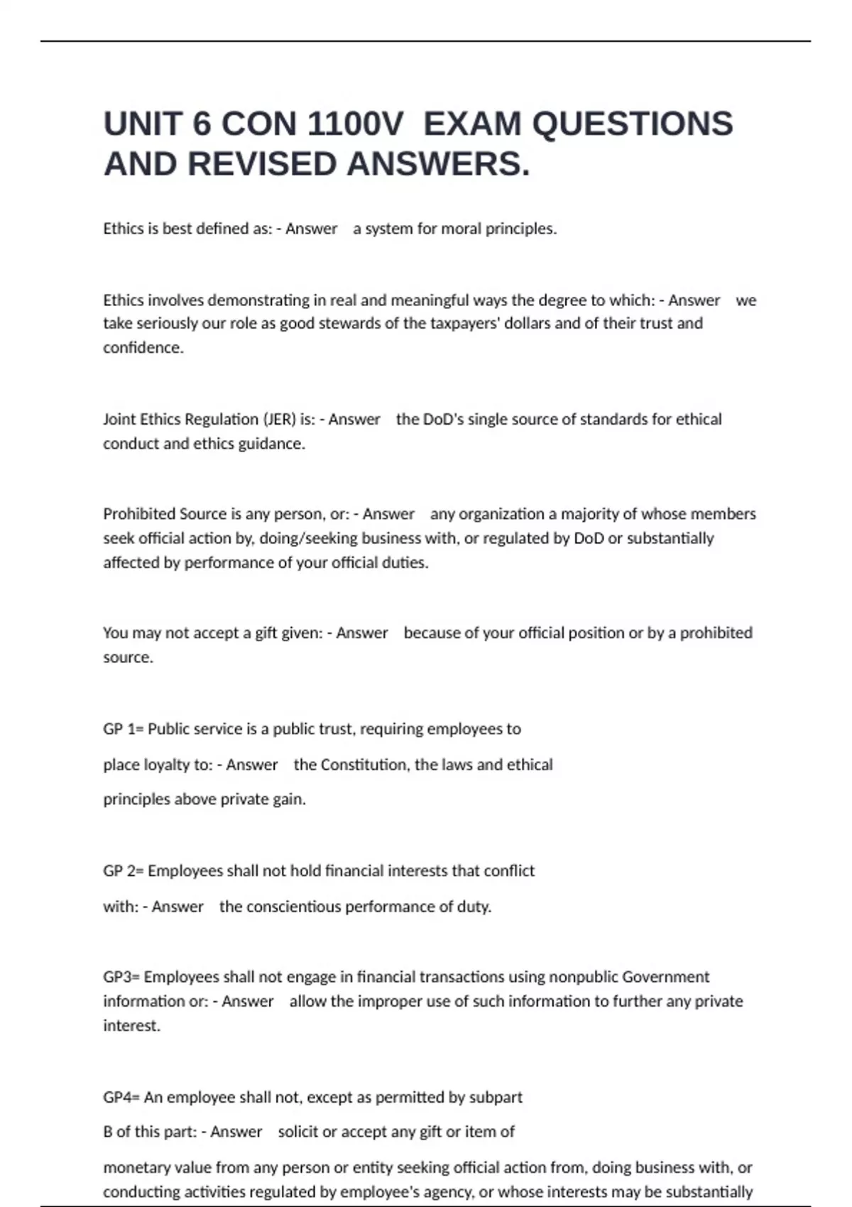 Ethics is best defined as: - Answer a system for moral principles. Ethics involves demonstrating in real and meaningful ways the degree to which: - Answer we take seriously our role as good stewards of the taxpayers' dollars and of their trust and confidence. Joint Ethics Regulation (JER) is: - Answer the DoD's single source of standards for ethical conduct and ethics guidance. Prohibited Source is any person, or: - Answer any organization a majority of whose members seek official action by, doing/seeking business with, or regulated by DoD or substantially affected by performance of your official duties. You may not accept a gift given: - Answer because of your official position or by a prohibited source. GP 1= Public service is a public trust, requiring employees to place loyalty to: - Answer the Constitution, the laws and ethical principles above private gain. GP 2= Employees shall not hold financial interests that conflict with: - Answer the conscientious performance of duty. GP3= Employees shall not engage in financial transactions using nonpublic Government information or: - Answer allow the improper use of such information to further any private interest. GP4= An employee shall not, except as permitted by subpart B of this part: - Answer solicit or accept any gift or item of monetary value from any person or entity seeking official action from, doing business with, or conducting activities regulated by employee's agency, or whose interests may be substantially affected by the performance/nonperformance of employee's duties. GP5= Employees shall put forth honest effort in: - Answer the performance of their duties.