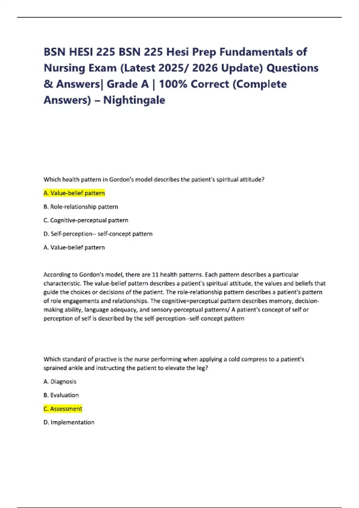 BSN 225 - HESI BSN 225 Hesi Prep FUNDAMENTALS EXAM QUESTIONS WITH COMPLETE SOLUTIONS