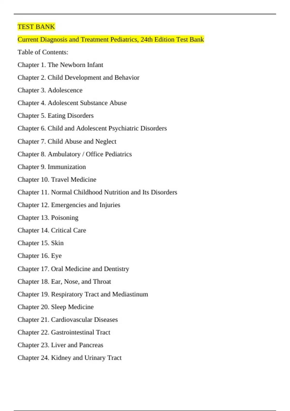 Current Diagnosis and Treatment Pediatrics, 24th Edition Test Bank