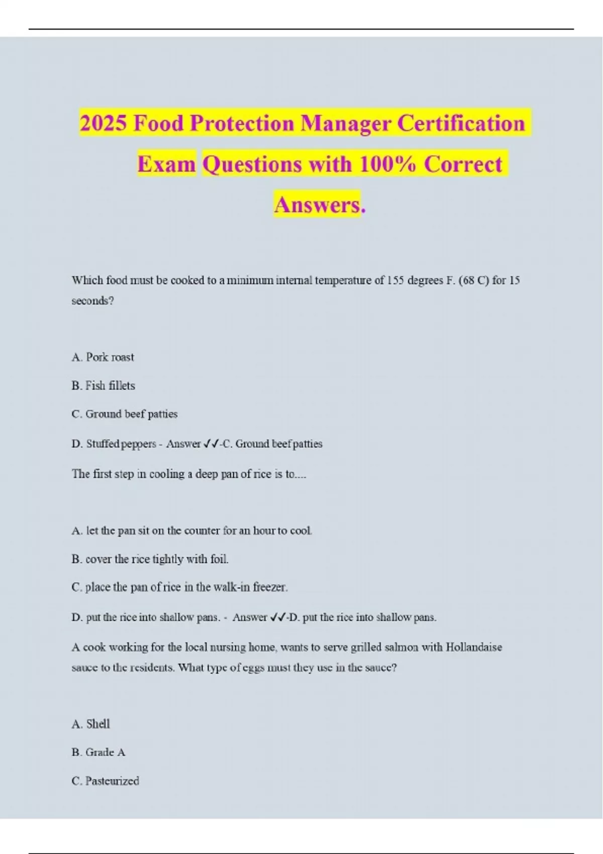 2025 Food Protection Manager Certification Exam Questions with 100% Correct Answers. Which food must be cooked to a minimum internal temperature of 155 degrees F. (68 C) for 15 seconds? A. Pork roast B. Fish fillets C. Ground beef patties D. Stuffed peppers - Answer ️️-C. Ground beef patties The first step in cooling a deep pan of rice is to.... A. let the pan sit on the counter for an hour to cool. B. cover the rice tightly with foil. C. place the pan of rice in the walk-in freezer. D. put the rice into shallow pans. - Answer ️️-D. put the rice into shallow pans. A cook working for the local nursing home, wants to serve grilled salmon with Hollandaise sauce to the residents. What type of eggs must they use in the sauce? A. Shell B. Grade A C. PasteurizedD. Fortified - Answer ️️-C. Pasteurized