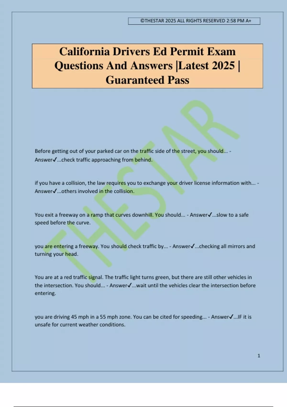 ©THESTAR 2025 ALL RIGHTS RESERVED 2:58 PM A+ 1 California Drivers Ed Permit Exam Questions And Answers |Latest 2025 | Guaranteed Pass Before getting out of your parked car on the traffic side of the street, you should... - Answer...check traffic approaching from behind. if you have a collision, the law requires you to exchange your driver license information with... - Answer...others involved in the collision. You exit a freeway on a ramp that curves downhill. You should... - Answer...slow to a safe speed before the curve. you are entering a freeway. You should check traffic by... - Answer...checking all mirrors and turning your head. You are at a red traffic signal. The traffic light turns green, but there are still other vehicles in the intersection. You should... - Answer...wait until the vehicles clear the intersection before entering. you are driving 45 mph in a 55 mph zone. You can be cited for speeding... - Answer...IF it is unsafe for current weather conditions. ©THESTAR 2025 ALL RIGHTS RESERVED 2:58 PM A+ 2 if you see orange construction signs and cones on a freeway, you must... - Answer...be prepared for workers and equipment ahead. if the roadway is wet and your car starts to skid, you should... - Answer...SLOWLY ease your foot off of the gas pedal. which way do you turn your front wheels when parked uphil next to a curb??? - AnswerAWAY from the curb when traffic is slow and heavy and you must cross railroad tracks before reaching the upcoming intersection, you should... - Answer...wait until you can completely cross the tracks before you proceed. u-turns in residential districts are legal... - Answer...when there are NO vehciles approaching nearby. At night, if an oncoming vehicle fails to dim its high beams, look... - Answer...toward the right edge of your lane. You must notify DMV within 5 days if you... - Answer...sell or transfer your vehicle. If a pedestrian is in a crosswalk in the middle of a block... - Answer...the pedestrian has the right of way! Parking is NEVER permitted... - Answer...in a crosshatched (diagonal) pattern space. A red arrow pointing to the right on a traffic light means you may... - AnswerNOT turn in that direction until the light turns g