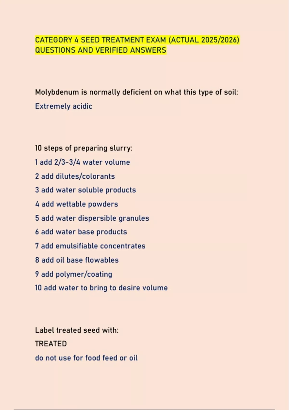 CATEGORY 4 SEED TREATMENT EXAM (ACTUAL 2025/2026) QUESTIONS AND VERIFIED ANSWERS