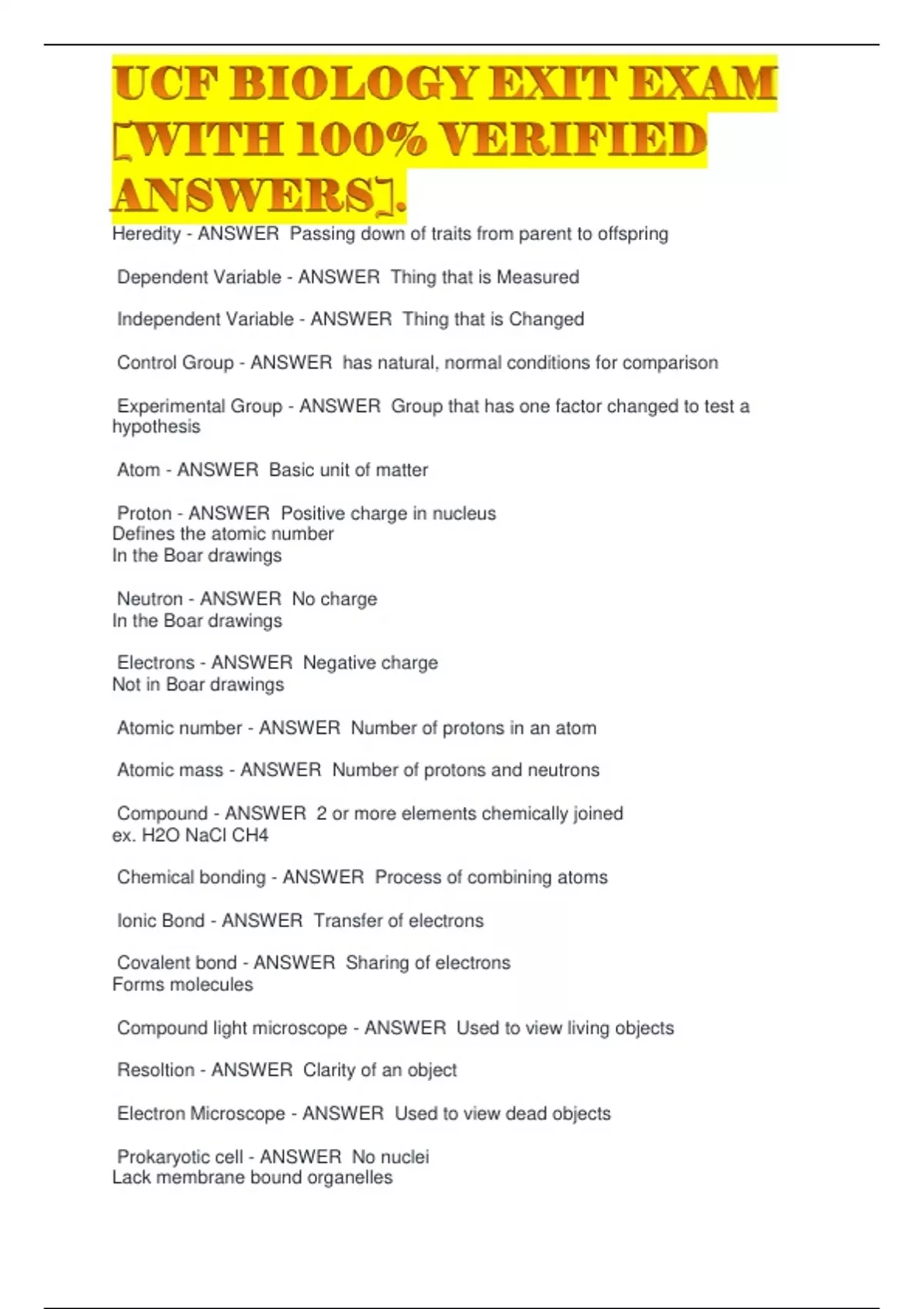 Heredity - ANSWER Passing down of traits from parent to offspring Dependent Variable - ANSWER Thing that is Measured Independent Variable - ANSWER Thing that is Changed Control Group - ANSWER has natural, normal conditions for comparison Experimental Group - ANSWER Group that has one factor changed to test a hypothesis Atom - ANSWER Basic unit of matter Proton - ANSWER Positive charge in nucleus Defines the atomic number In the Boar drawings Neutron - ANSWER No charge In the Boar drawings Electrons - ANSWER Negative charge Not in Boar drawings Atomic number - ANSWER Number of protons in an atom Atomic mass - ANSWER Number of protons and neutrons Compound - ANSWER 2 or more elements chemically joined ex. H2O NaCl CH4 Chemical bonding - ANSWER Process of combining atoms Ionic Bond - ANSWER Transfer of electrons