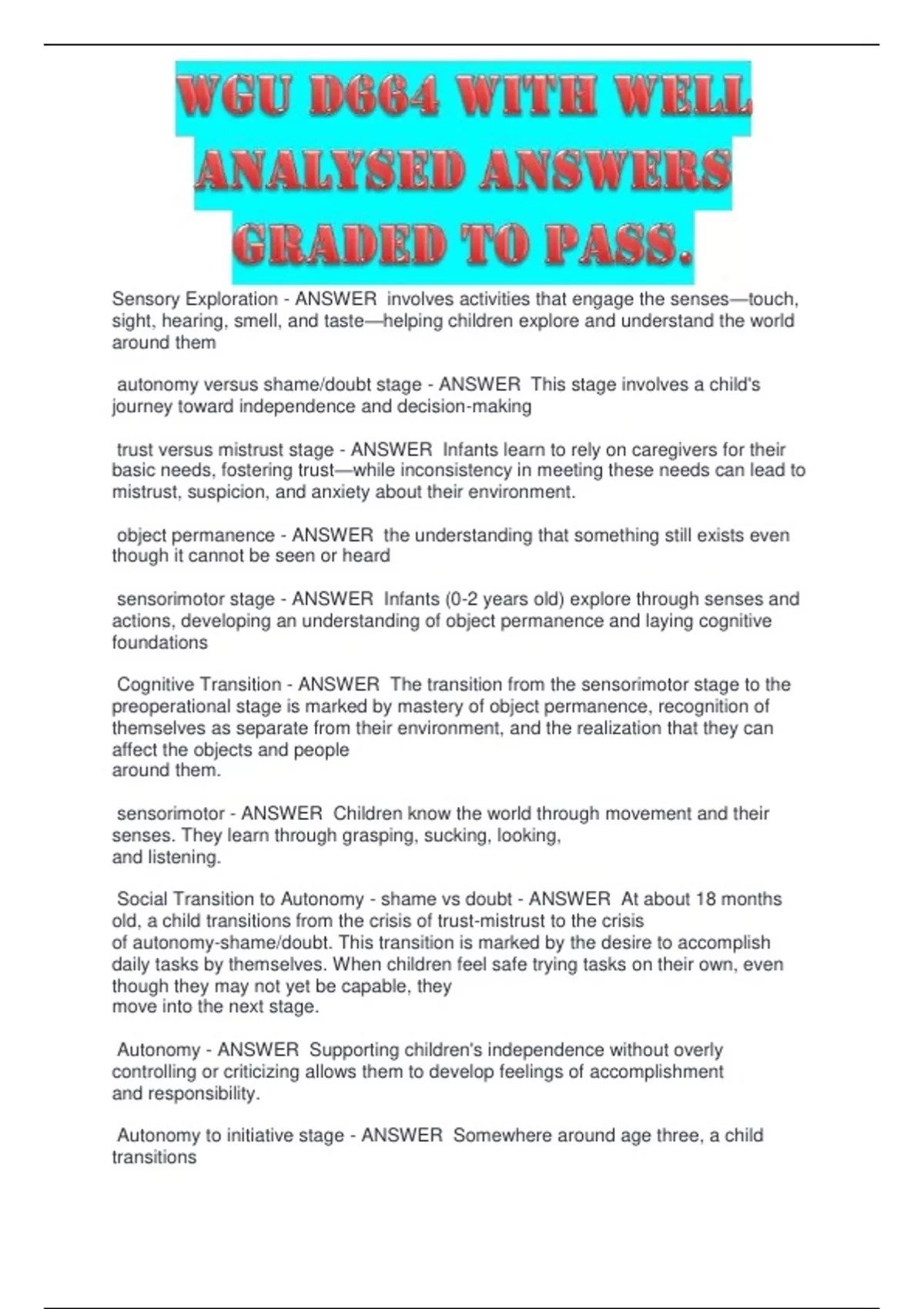 Sensory Exploration - ANSWER involves activities that engage the senses—touch, sight, hearing, smell, and taste—helping children explore and understand the world around them autonomy versus shame/doubt stage - ANSWER This stage involves a child's journey toward independence and decision-making trust versus mistrust stage - ANSWER Infants learn to rely on caregivers for their basic needs, fostering trust—while inconsistency in meeting these needs can lead to mistrust, suspicion, and anxiety about their environment. object permanence - ANSWER the understanding that something still exists even though it cannot be seen or heard sensorimotor stage - ANSWER Infants (0-2 years old) explore through senses and actions, developing an understanding of object permanence and laying cognitive foundations Cognitive Transition - ANSWER The transition from the sensorimotor stage to the preoperational stage is marked by mastery of object permanence, recognition of themselves as separate from their environment, and the realization that they can affect the objects and people around them. sensorimotor - ANSWER Children know the world through movement and their senses. They learn through grasping, sucking, looking, and listening. Social Transition to Autonomy - shame vs doubt - ANSWER At about 18 months old, a child transitions from the crisis of trust-mistrust to the crisis of autonomy-shame/doubt. This transition is marked by the desire to accomplish daily tasks by themselves. When children feel safe trying tasks on their own, even though they may not yet be capable, they move into the next stage.