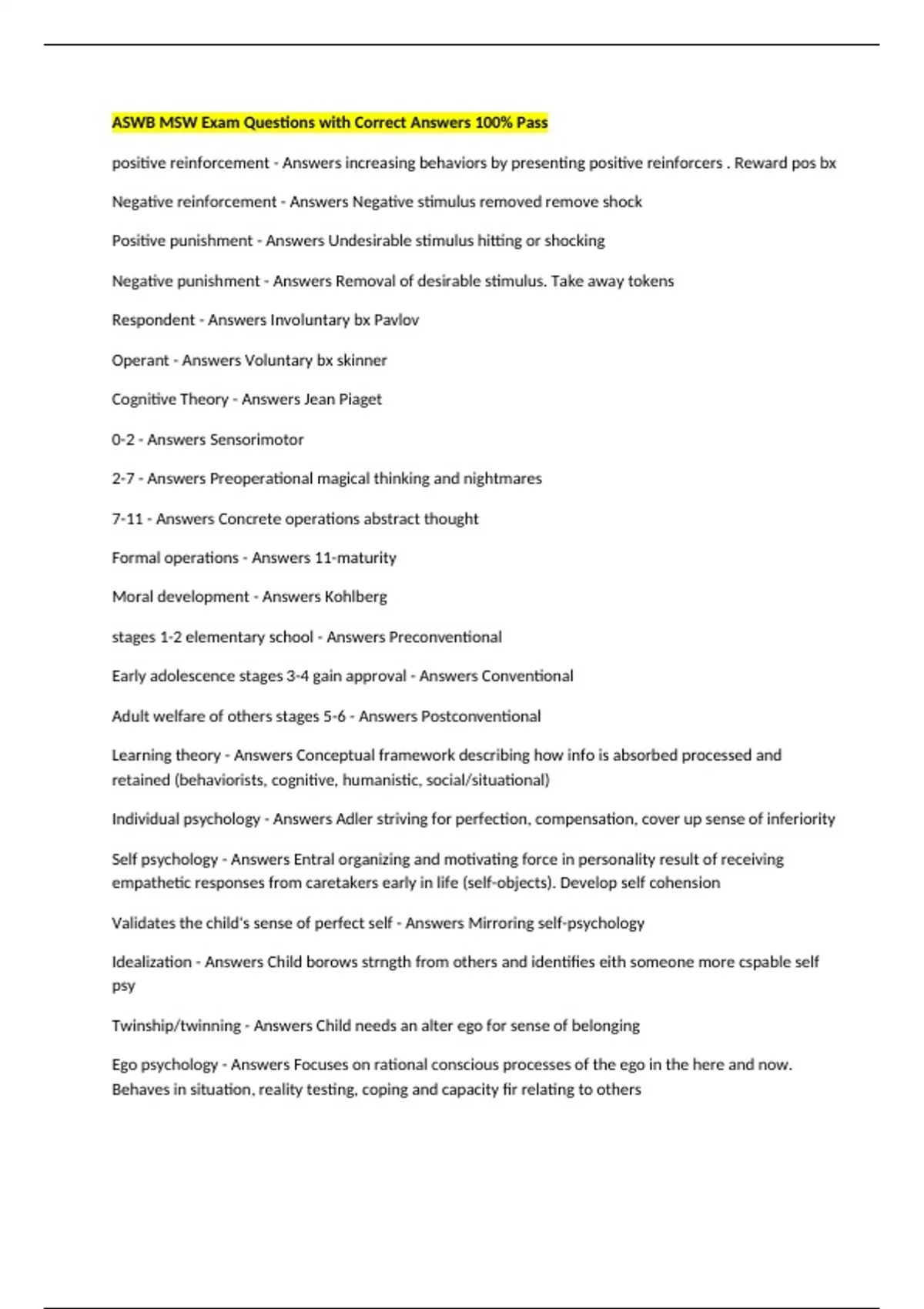 ASWB MSW Exam Questions with Correct Answers 100% Pass positive reinforcement - Answers increasing behaviors by presenting positive reinforcers . Reward pos bx Negative reinforcement - Answers Negative stimulus removed remove shock Positive punishment - Answers Undesirable stimulus hitting or shocking Negative punishment - Answers Removal of desirable stimulus. Take away tokens Respondent - Answers Involuntary bx Pavlov Operant - Answers Voluntary bx skinner Cognitive Theory - Answers Jean Piaget 0-2 - Answers Sensorimotor 2-7 - Answers Preoperational magical thinking and nightmares 7-11 - Answers Concrete operations abstract thought Formal operations - Answers 11-maturity Moral development - Answers Kohlberg stages 1-2 elementary school - Answers Preconventional Early adolescence stages 3-4 gain approval - Answers Conventional Adult welfare of others stages 5-6 - Answers Postconventional Learning theory - Answers Conceptual framework describing how info is absorbed processed and retained (behaviorists, cognitive, humanistic, social/situational) Individual psychology - Answers Adler striving for perfection, compensation, cover up sense of inferiority Self psychology - Answers Entral organizing and motivating force in personality result of receiving empathetic responses from caretakers early in life (self-objects). Develop self cohension Validates the child's sense of perfect self - Answers Mirroring self-psychology Idealization - Answers Child borows strngth from others and identifies eith someone more cspable self psy Twinship/twinning - Answers Child needs an alter ego for sense of belonging Ego psychology - Answers Focuses on rational conscious processes of the ego in the here and now. Behaves in situation, reality testing, coping and capacity fir relating to others Psychosocial dev focuses on how children socialize - Answers Eric Erickson 8 stages Trust v mistrust - Answers Birth-one trust based on consistency of caregivers Autonomy v shame-doubt - Answers 1-3 assert independence initiative v guilt - Answers Erik Erikson's social crisis stage 3, age 3-5. Industry vs. Inferiority - Answers 6-12 years sense of pride in accomplisments identity vs. role confusion - Answers Erikson's stage during which teenagers and young adults search for and become their true selves intimacy vs isolation - Answers young adulthood-willing to be open about self and commit to a close personal relationship Generativity vs. Stagnation - Answers Middle Adulthood ego integrity vs despair - Answers during later life-has one led a satisfied life object relations theory - Answers Mahler relationships with others strongly rooted in early attachments Normal autism - Answers 0-1 Normal Symbiotic Phase - Answers until 5 mo. - aware of mother but not individualized - Mahler Sep. / Indivi. Theory Separation/individuation phase - Answers 5-9 mo Practicing - Answers 9-15 mo Rapprochement - Answers 15-24 mo physical mobility can dev fear of abondonment object constancy phase - Answers 24-38 mo child and mother have separate identity Person In Environment Perspective - Answers Ct as part of an environmental system and encompasses all influences, client centered defense mechanisms - Answers mental processes that protect individuals from strong or stressful emotions and situations Devaluation - Answers BPD exageratted negative qualities to self or others Idealization - Answers Admiring someone so much that you see them as perfect Introjection - Answers Incorporation of values or qualities of an admired person or group into