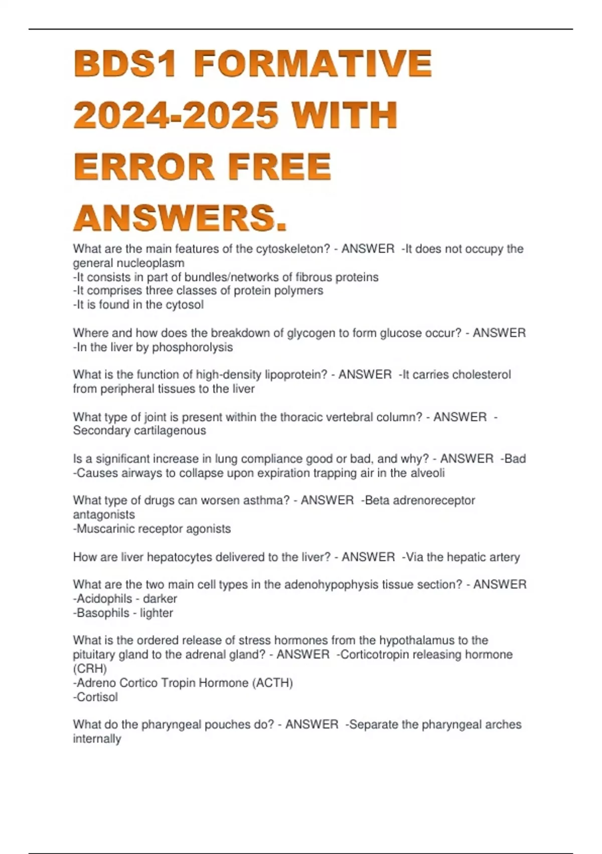 What are the main features of the cytoskeleton? - ANSWER -It does not occupy the general nucleoplasm -It consists in part of bundles/networks of fibrous proteins -It comprises three classes of protein polymers -It is found in the cytosol Where and how does the breakdown of glycogen to form glucose occur? - ANSWER -In the liver by phosphorolysis What is the function of high-density lipoprotein? - ANSWER -It carries cholesterol from peripheral tissues to the liver What type of joint is present within the thoracic vertebral column? - ANSWER -Secondary cartilagenous Is a significant increase in lung compliance good or bad, and why? - ANSWER -Bad -Causes airways to collapse upon expiration trapping air in the alveoli What type of drugs can worsen asthma? - ANSWER -Beta adrenoreceptor antagonists -Muscarinic receptor agonists How are liver hepatocytes delivered to the liver? - ANSWER -Via the hepatic artery What are the two main cell types in the adenohypophysis tissue section? - ANSWER -Acidophils - darker