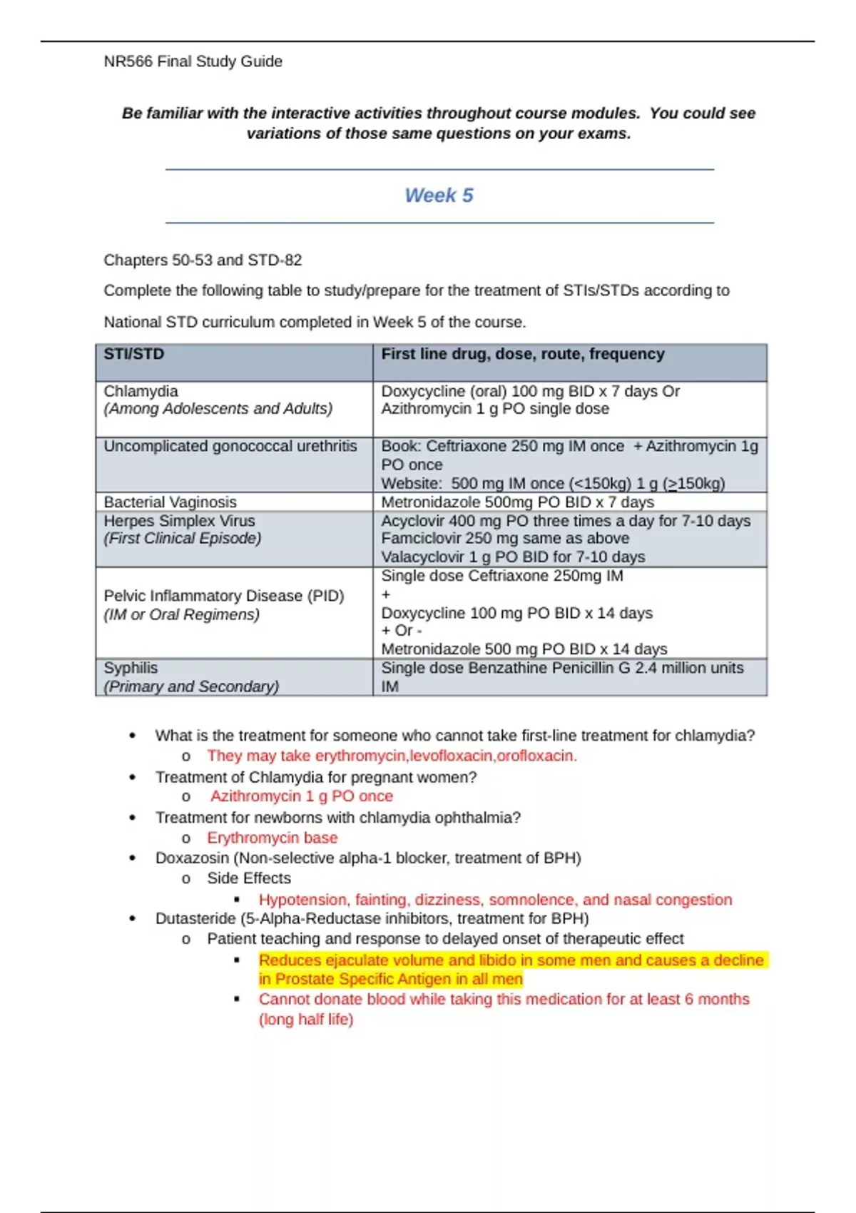 Chapters 50-53 and STD-82 Complete the following table to study/prepare for the treatment of STIs/STDs according to National STD curriculum completed in Week 5 of the course. STI/STD First line drug, dose, route, frequency Chlamydia (Among Adolescents and Adults) Doxycycline (oral) 100 mg BID x 7 days Or Azithromycin 1 g PO single dose Uncomplicated gonococcal urethritis Book: Ceftriaxone 250 mg IM once + Azithromycin 1g PO once Website: 500 mg IM once (150kg) 1 g (150kg) Bacterial Vaginosis Metronidazole 500mg PO BID x 7 days Herpes Simplex Virus (First Clinical Episode) Acyclovir 400 mg PO three times a day for 7-10 days Famciclovir 250 mg same as above Valacyclovir 1 g PO BID for 7-10 days Pelvic Inflammatory Disease (PID) (IM or Oral Regimens) Single dose Ceftriaxone 250mg IM + Doxycycline 100 mg PO BID x 14 days + Or - Metronidazole 500 mg PO BID x 14 days Syphilis (Primary and Secondary) Single dose Benzathine Penicillin G 2.4 million units IM  What is the treatment for someone who cannot take first-line treatment for chlamydia? o They may take erythromycin,levofloxacin,orofloxacin.  Treatment of Chlamydia for pregnant women? o Azithromycin 1 g PO once  Treatment for newborns with chlamydia ophthalmia? o Erythromycin base  Doxazosin (Non-selective alpha-1 blocker, treatment of BPH) o Side Effects  Hypotension, fainting, dizziness, somnolence, and nasal congestion  Dutasteride (5-Alpha-Reductase inhibitors, treatment for BPH) o Patient teaching and response to delayed onset of therapeutic effect  Reduces ejaculate volume and libido in some men and causes a decline