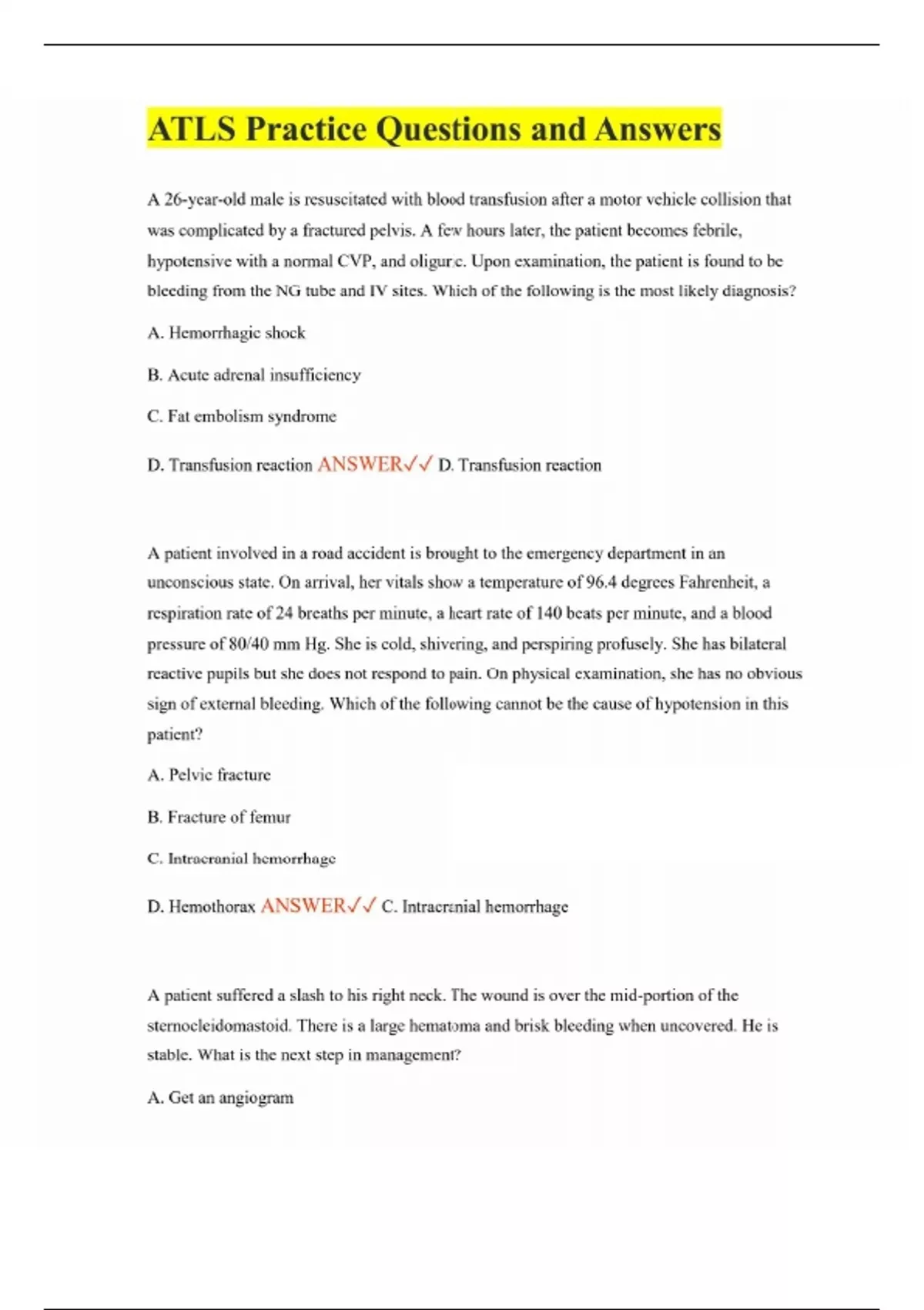 ATLS Practice Questions and Answers A 26-year-old male is resuscitated with blood transfusion after a motor vehicle collision that was complicated by a fractured pelvis. A few hours later, the patient becomes febrile, hypotensive with a normal CVP, and oliguric. Upon examination, the patient is found to be bleeding from the NG tube and IV sites. Which of the following is the most likely diagnosis? A. Hemorrhagic shock B. Acute adrenal insufficiency C. Fat embolism syndrome D. Transfusion reaction ANSWER D. Transfusion reaction A patient involved in a road accident is brought to the emergency department in an unconscious state. On arrival, her vitals show a temperature of 96.4 degrees Fahrenheit, a respiration rate of 24 breaths per minute, a heart rate of 140 beats per minute, and a blood pressure of 80/40 mm Hg. She is cold, shivering, and perspiring profusely. She has bilateral reactive pupils but she does not respond to pain. On physical examination, she has no obvious sign of external bleeding. Which of the following cannot be the cause of hypotension in this patient? A. Pelvic fracture B. Fracture of femur C. Intracranial hemorrhage D. Hemothorax ANSWER C. Intracranial hemorrhage A patient suffered a slash to his right neck. The wound is over the mid-portion of the sternocleidomastoid. There is a large hematoma and brisk bleeding when uncovered. He is stable. What is the next step in management? A. Get an angiogram B. Close the wound in the ER