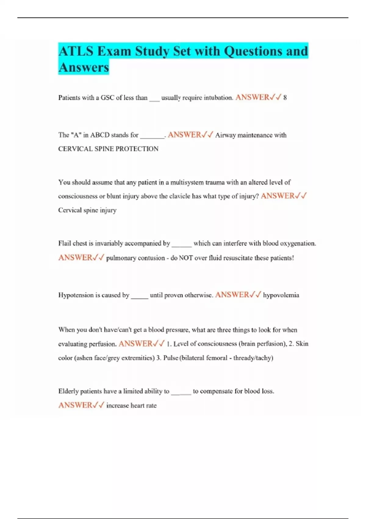 ATLS Exam Study Set with Questions and Answers Patients with a GSC of less than ___ usually require intubation. ANSWER 8 The "A" in ABCD stands for _______. ANSWER Airway maintenance with CERVICAL SPINE PROTECTION You should assume that any patient in a multisystem trauma with an altered level of consciousness or blunt injury above the clavicle has what type of injury? ANSWER Cervical spine injury Flail chest is invariably accompanied by ______ which can interfere with blood oxygenation. ANSWER pulmonary contusion - do NOT over fluid resuscitate these patients! Hypotension is caused by _____ until proven otherwise. ANSWER hypovolemia When you don't have/can't get a blood pressure, what are three things to look for when evaluating perfusion. ANSWER 1. Level of consciousness (brain perfusion), 2. Skin color (ashen face/grey extremities) 3. Pulse (bilateral femoral - thready/tachy) Elderly patients have a limited ability to ______ to compensate for blood loss. ANSWER increase heart rate Resuscitation fluids should be warmed 39 degrees Celsius (102.2 F). Can you use a